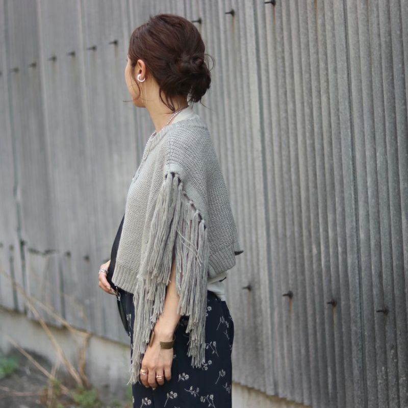 袖に施した存在感のあるフリンジと短丈の畦編み身頃が絶妙なバランスで今年らしいコーディネートのアクセントに。
