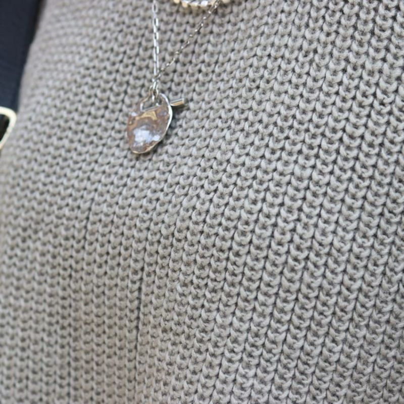 ポンチョ型で脇元が開いてるのでパフスリーブやドルマン型のトップスにも干渉することなく重ね着できるアイテムです。