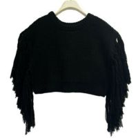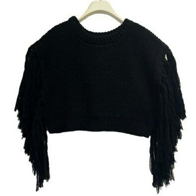 肩口から長く垂れるフリンジが目をひくオシャレニットトップス。
