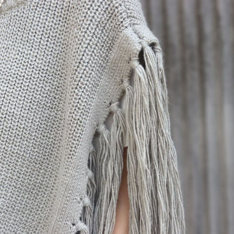 ポンチョ型で脇元が開いてるのでパフスリーブやドルマン型のトップスにも干渉することなく重ね着できるアイテムです。