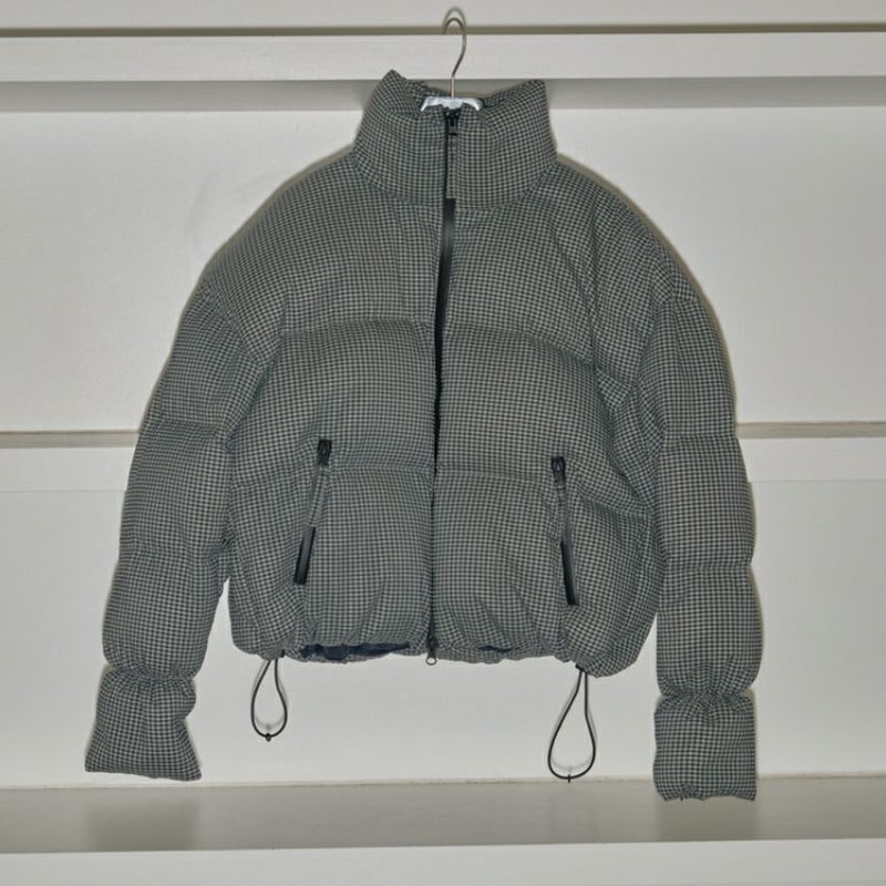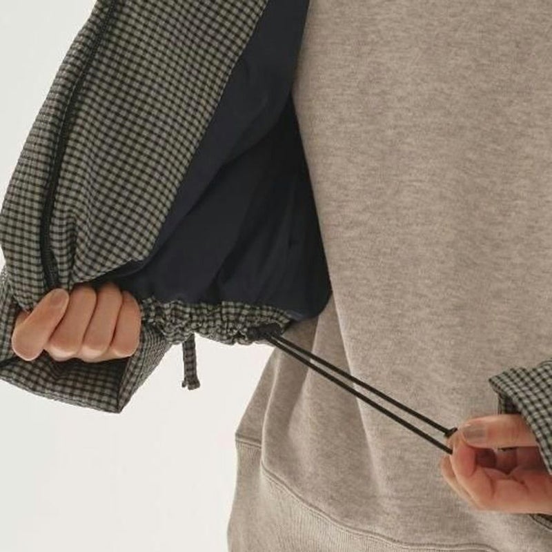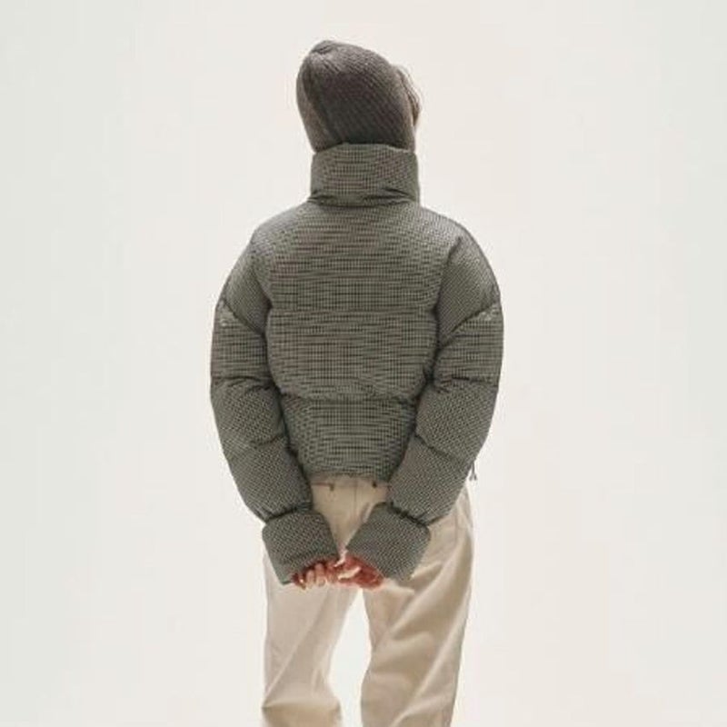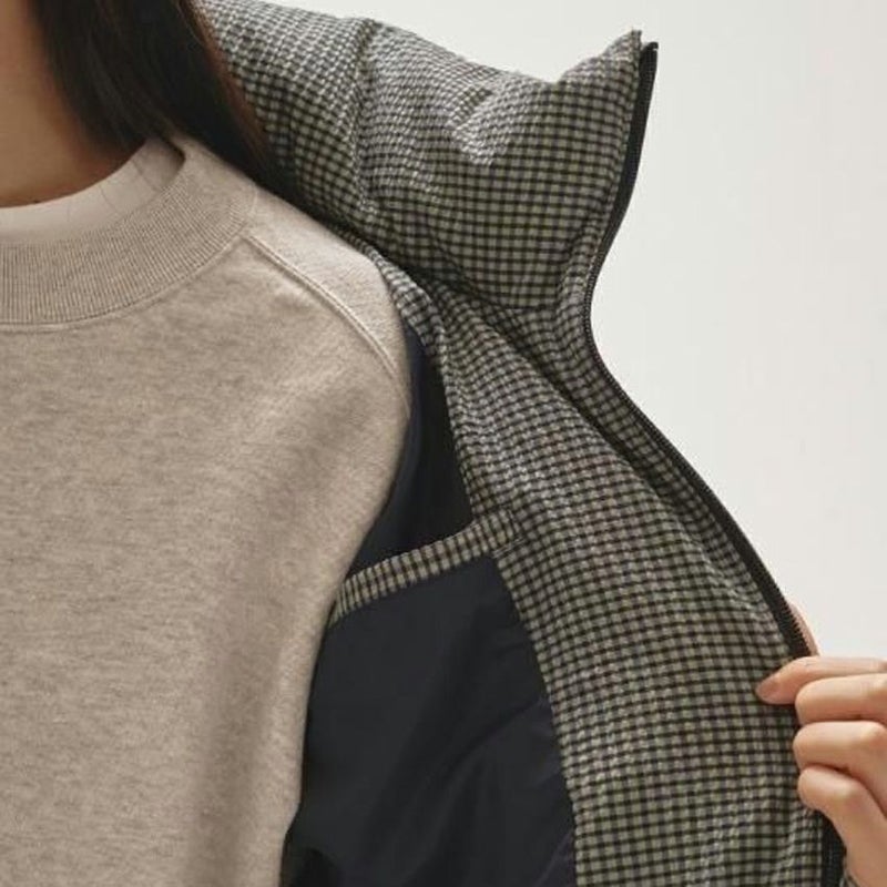 国内のワッシャー感のあるチェック生地を使用したダウンジャケット。