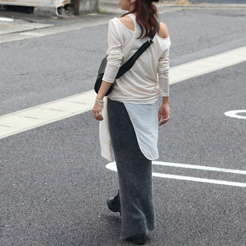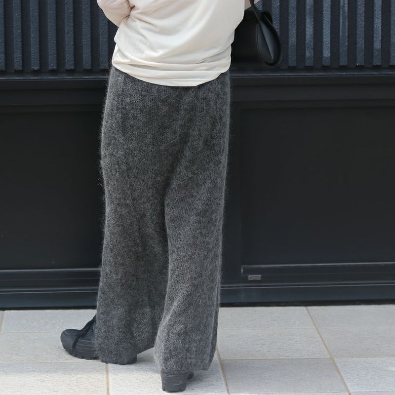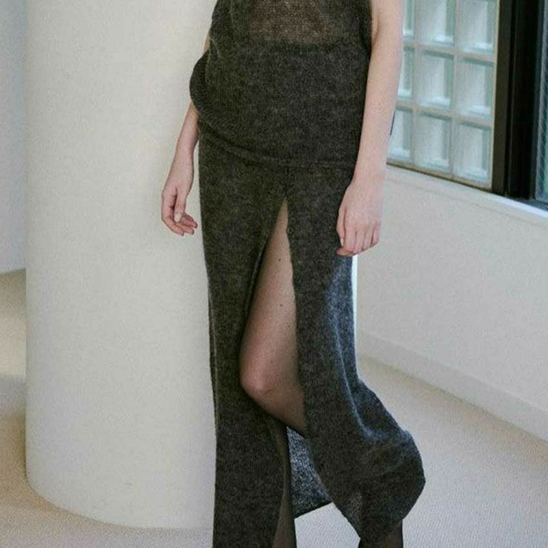程よいシアー感で女性らしさを引き立てるデザインスカート。モヘア混の柔らかな糸で編み上げられ、フロントには華奢なボタンをたっぷりあしらいました。