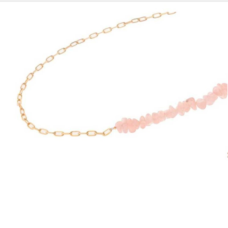 ローズピンクの天然石とシルバーチェーンのコントラストがトレンド感と洗練されたデザイン性が光る一本。