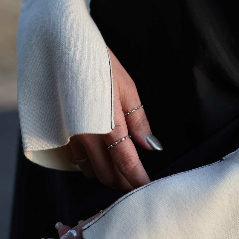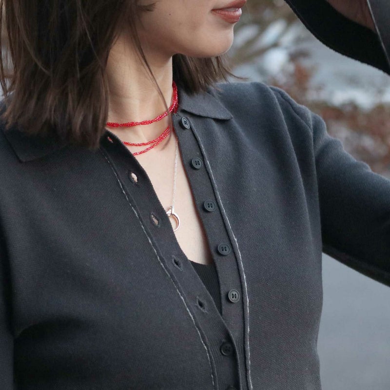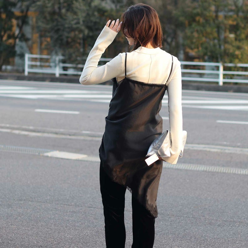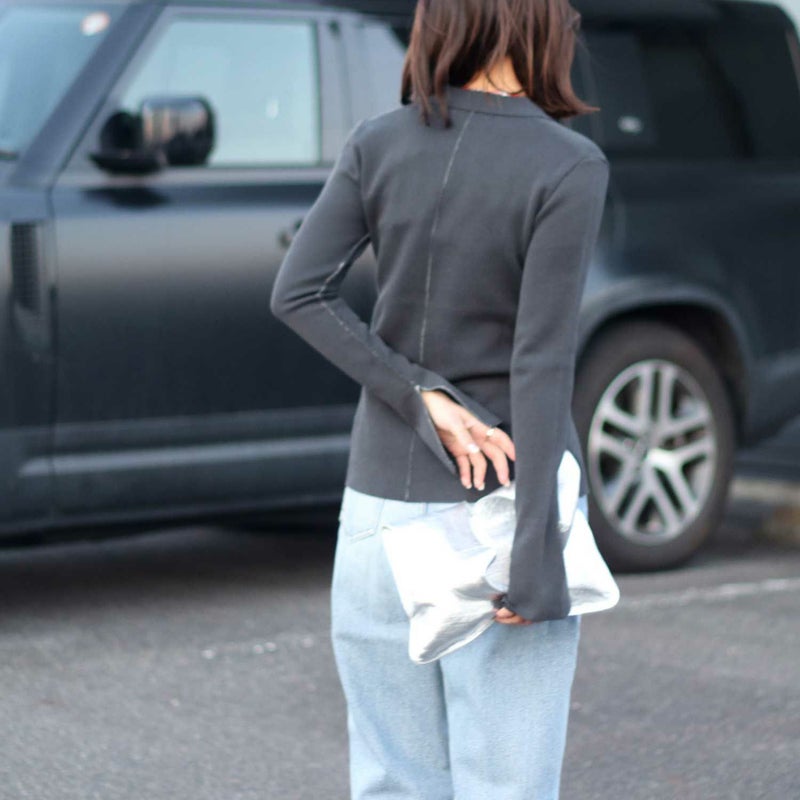 身体のラインに優しく沿いながらも、コンパクト過ぎない絶妙なサイジングで、抜け感のある洗練された印象に仕上げました。