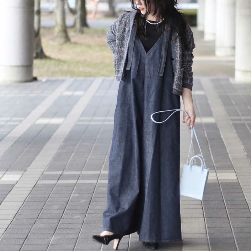 カジュアルになりがちなデニムサロペットを、大人っぽく洗練された印象に仕上げました。