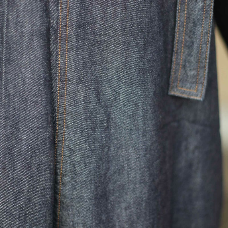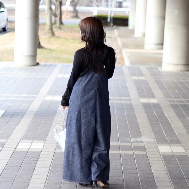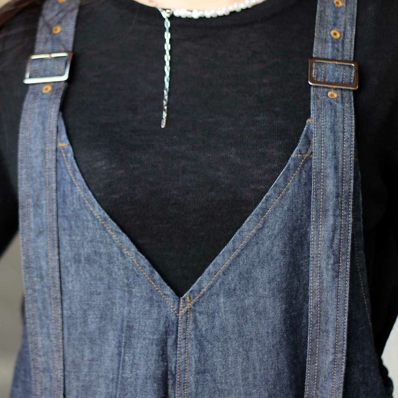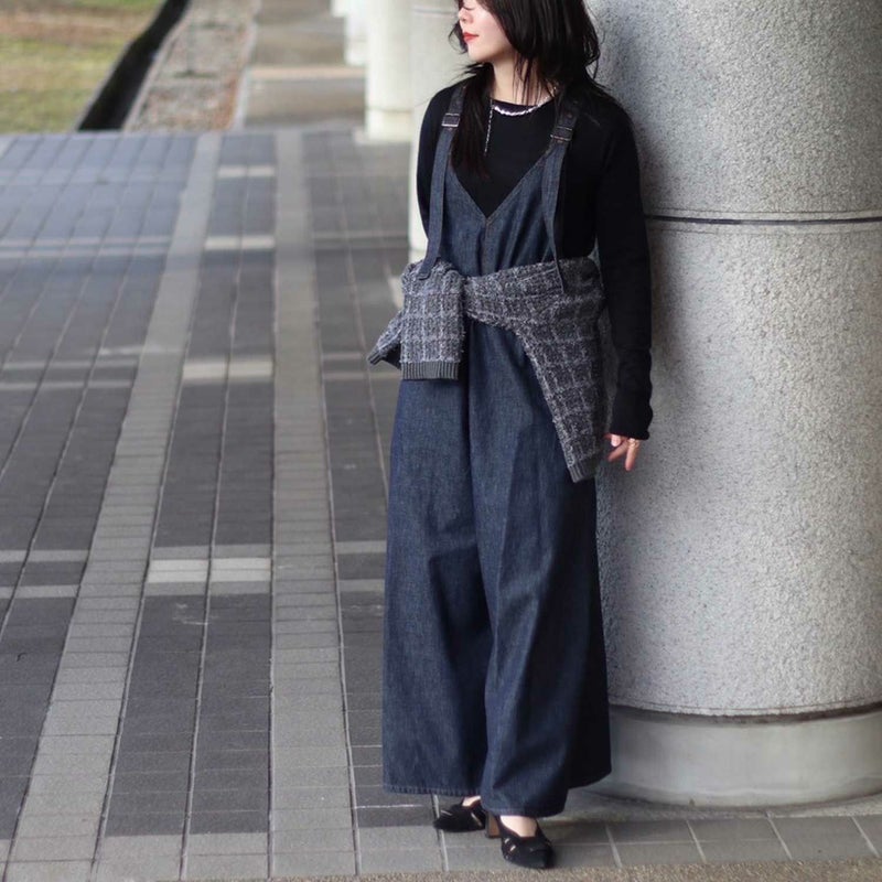 ライトオンスデニムを使用した、ゆったりとしたシルエットが女性らしさを引き立てるサロペット。
