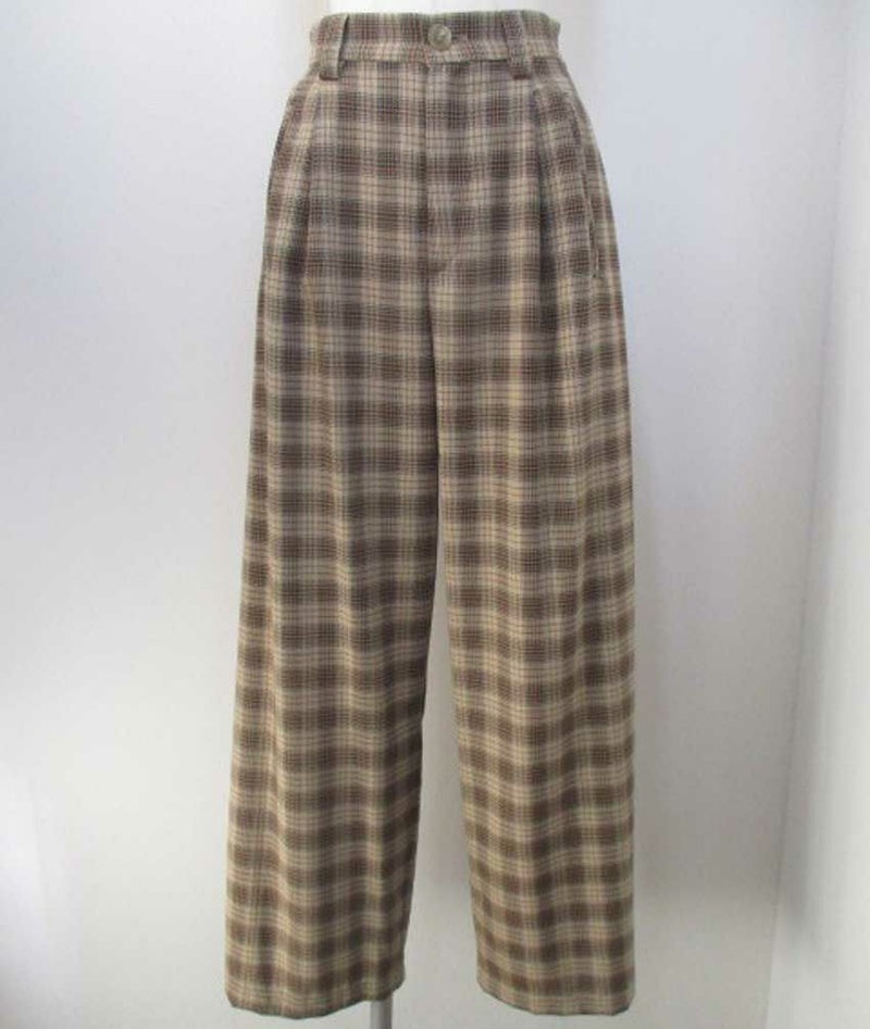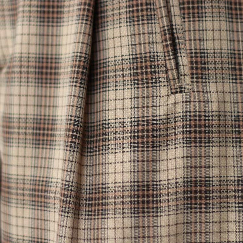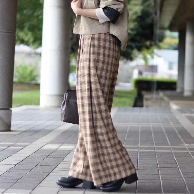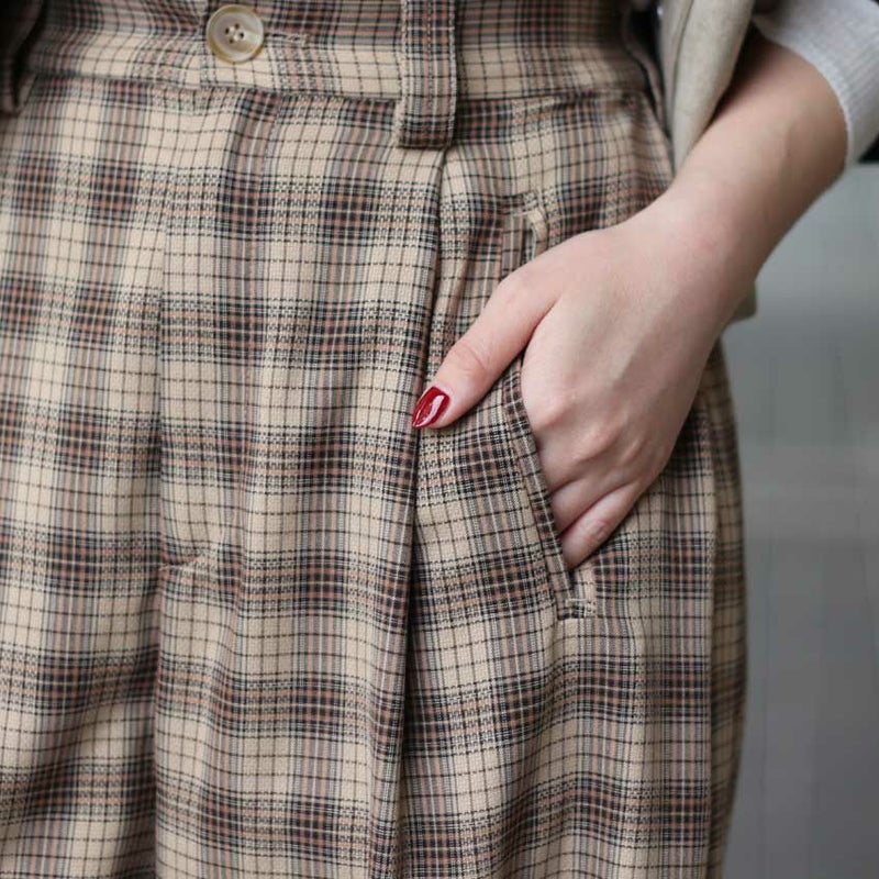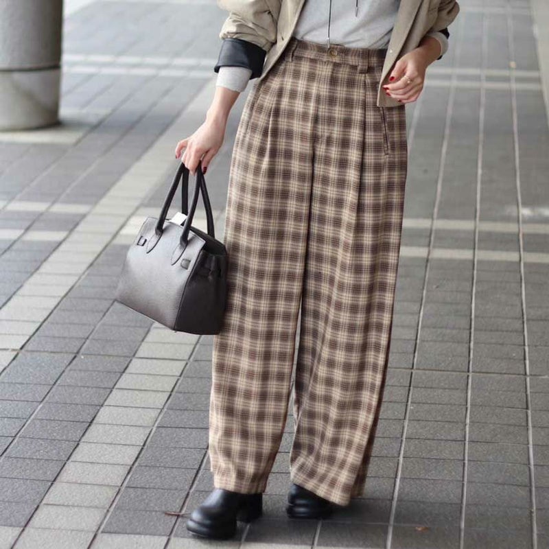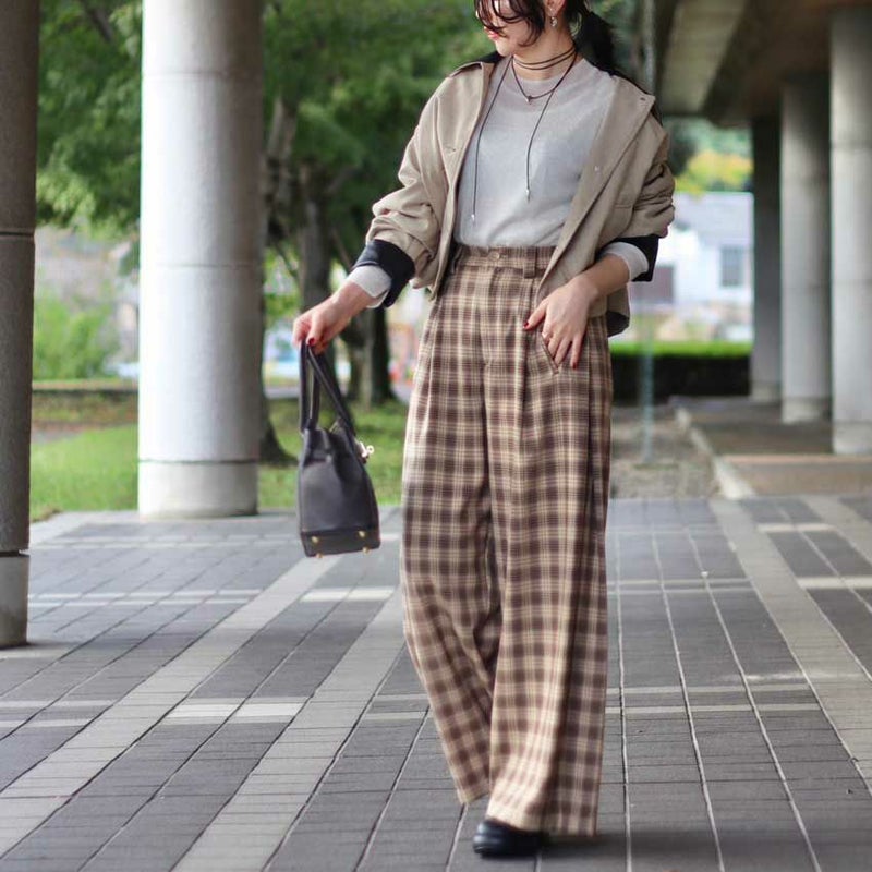 やわらかなベージュとブラウンでまとめた落ち着きのあるチェック柄が、大人の抜け感と上品さを演出します。