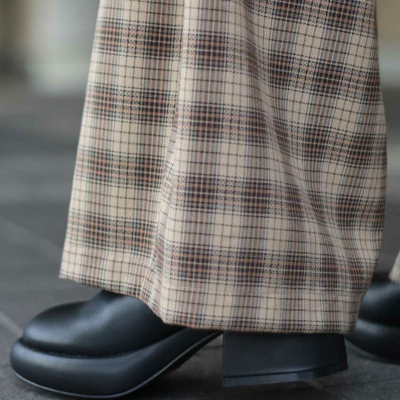 スタイリングの主役になるチェック柄のサイドタックパンツ。