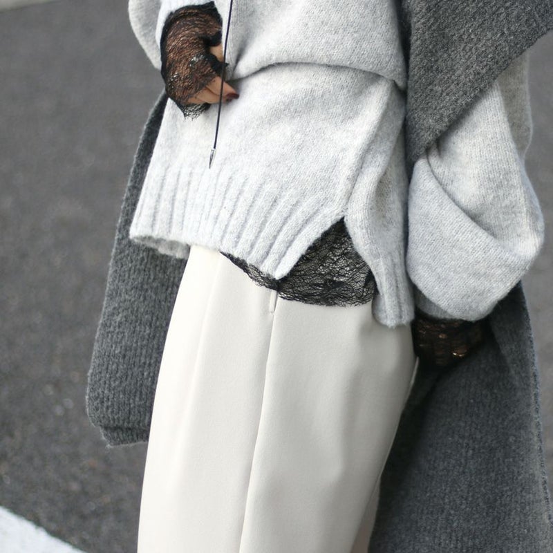 裾や首元にはリブ風の切替えをあしらい、全体の印象を引き締めつつ、さりげないアクセントをプラス。