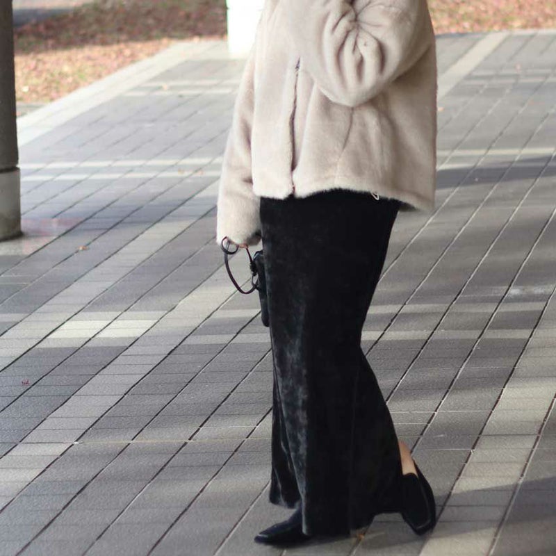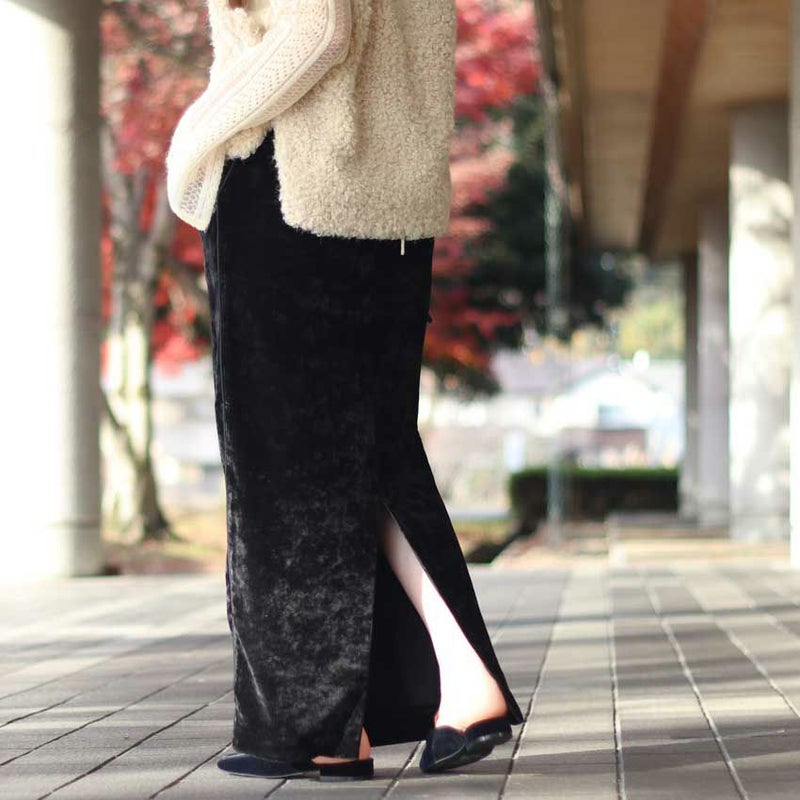 上品な光沢が美しいベルベット素材を贅沢に使用した、大人の雰囲気漂うストレートスカート。