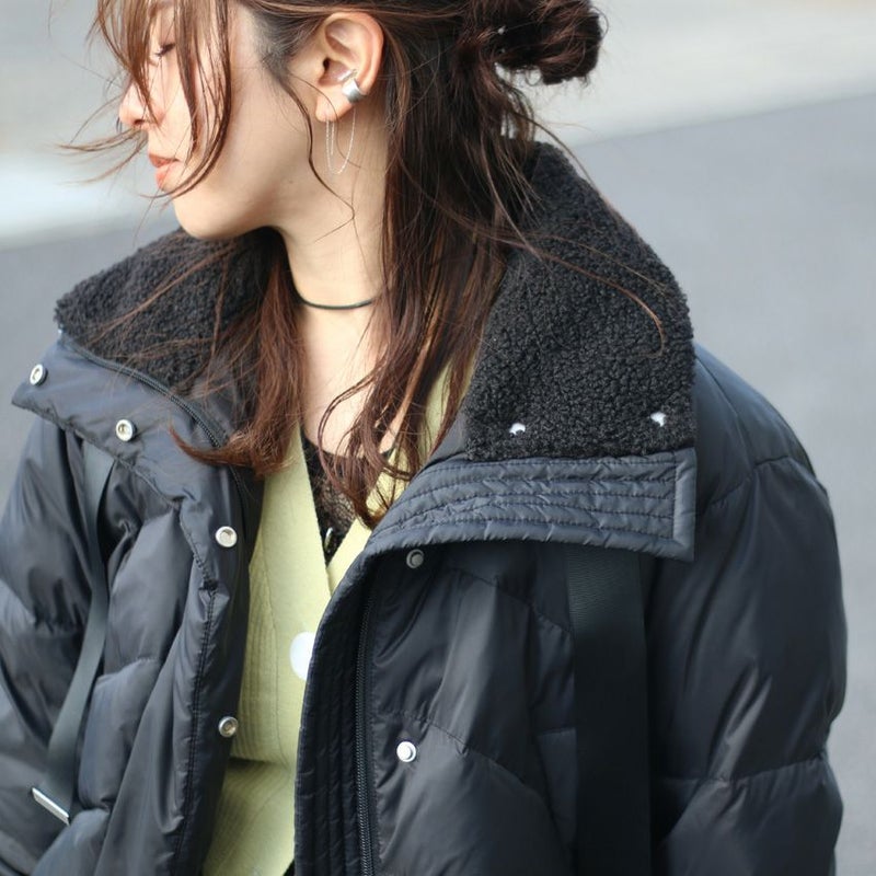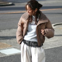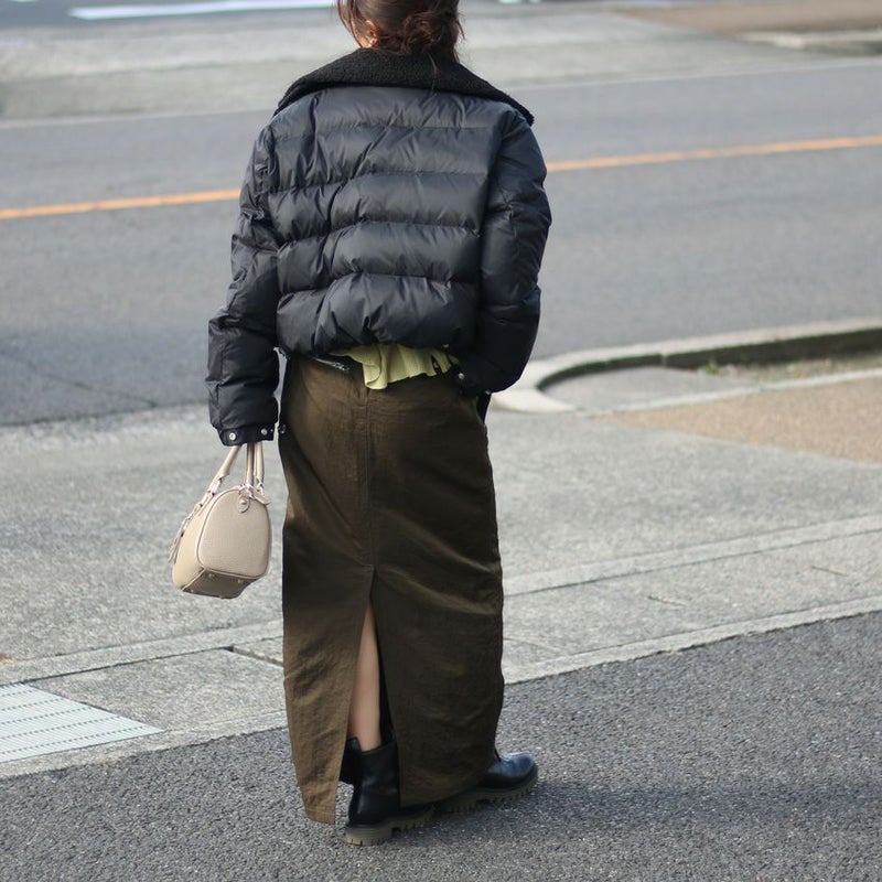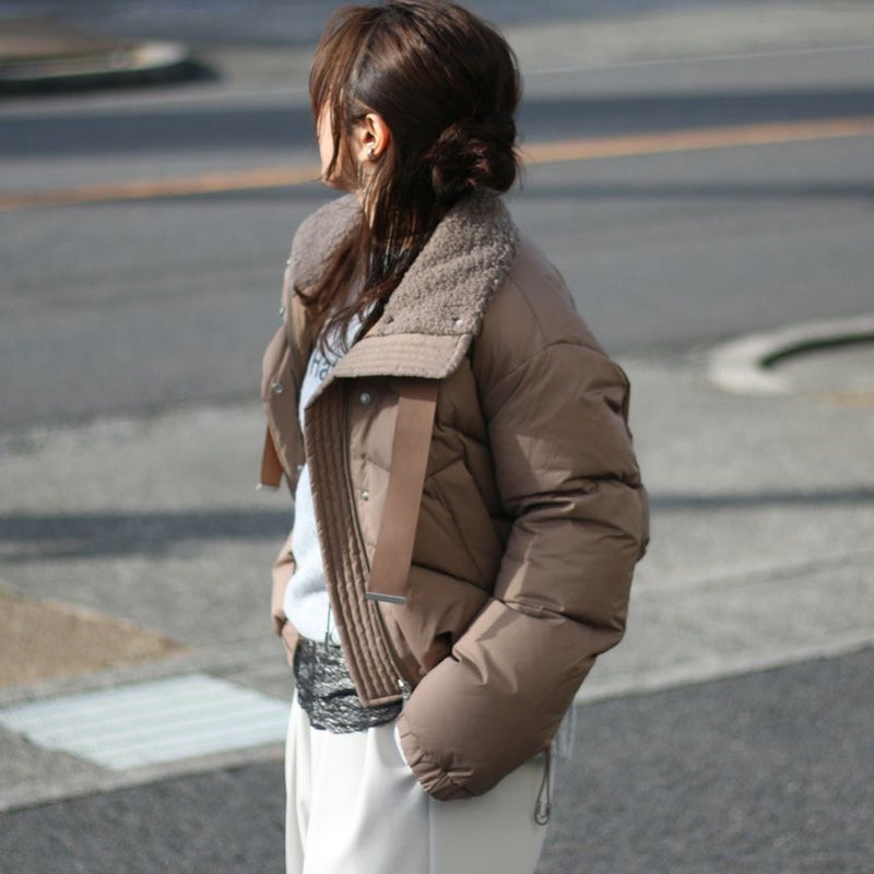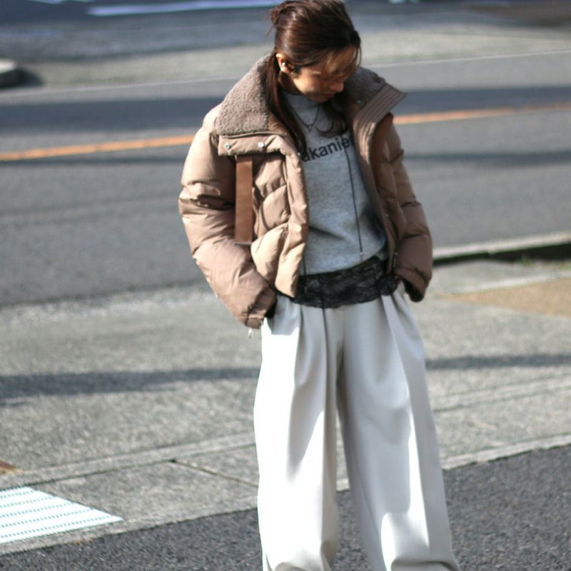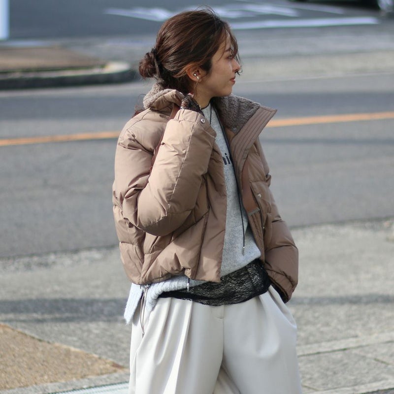 カジュアルになりがちなダウンに、女性らしい華やかさをプラスしています。