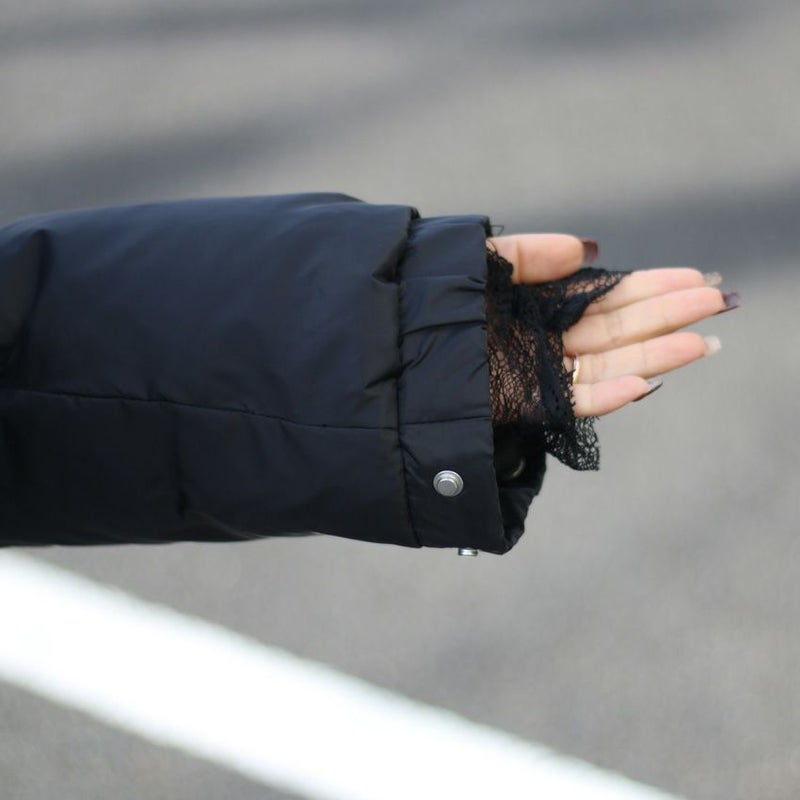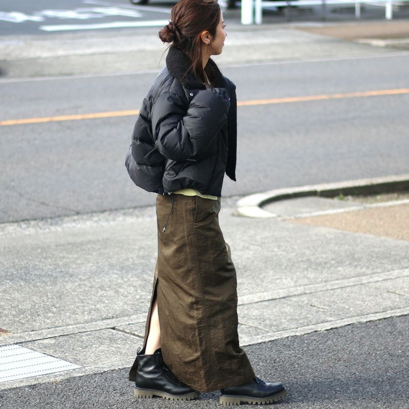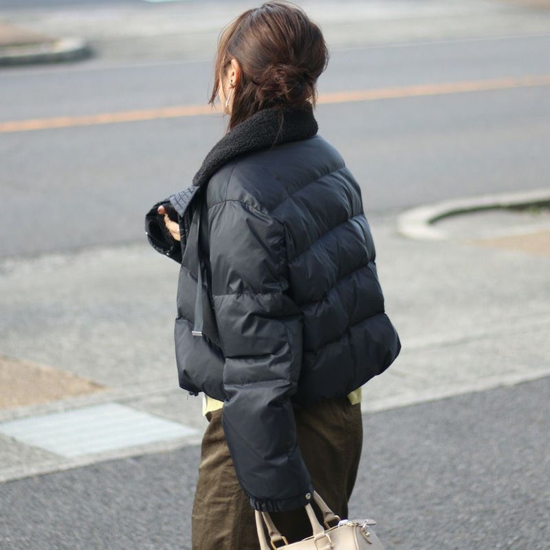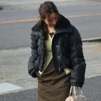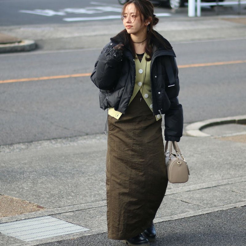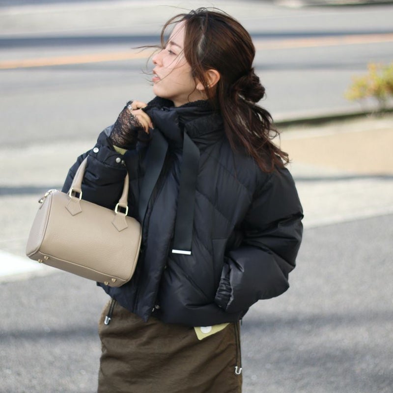 カジュアルになりがちなダウンに、女性らしい華やかさをプラスしています。