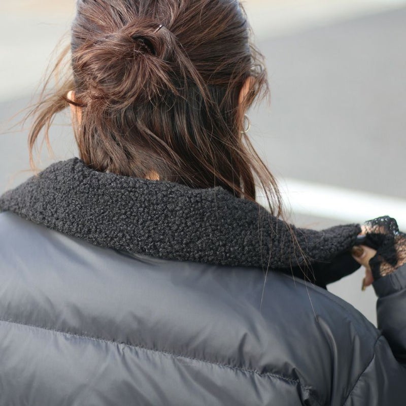 顔まわりを優しく包み込む 大きめのボア襟 と、 アクセントになる 太めのリボンコード が、他にはない“大人かわいい”印象を演出。