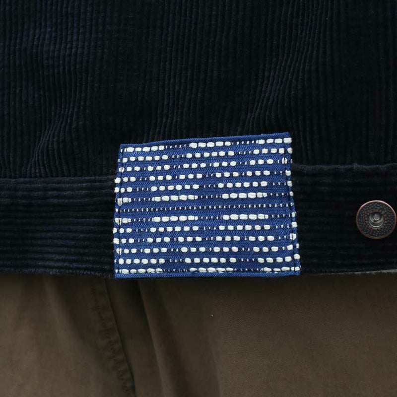 背面右側にはさりげなく民族刺し子のパッチを施し、無骨さの中に遊び心を添えています。