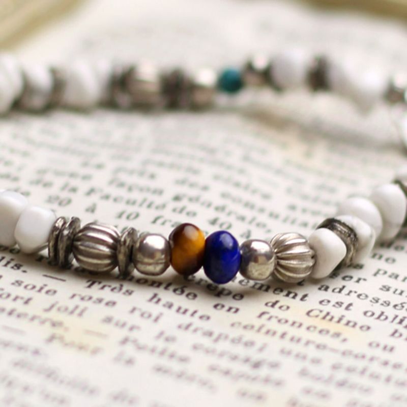 ホワイトには「ハウライト、タイガーアイ、ラピスラズリー、ターコイズ」を使用して複数の天然石を使っていながらしっかりと統一感があり、夏の鉄板アクセサリーになってくれそうです