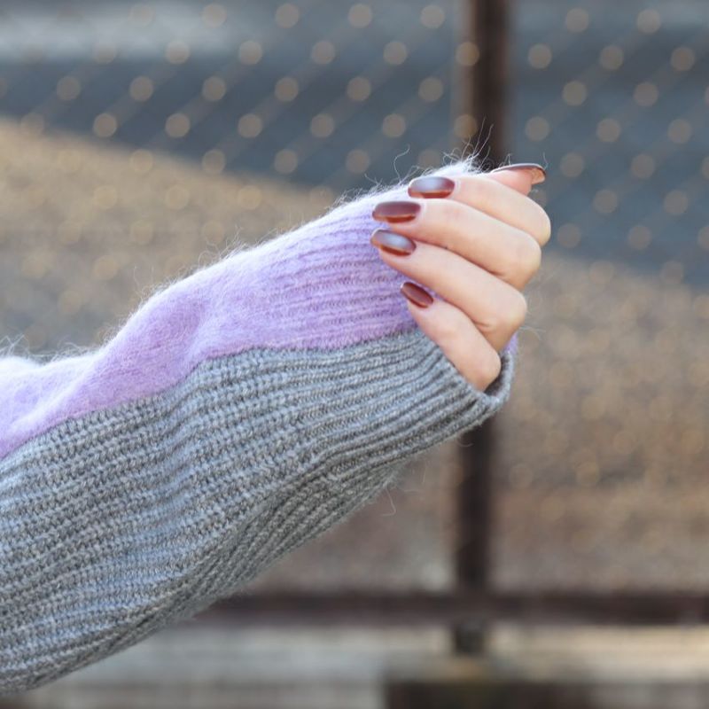 動くたびにドラマチックな表情を見せる、アルパカシャギーのカラーブロッキングニット。