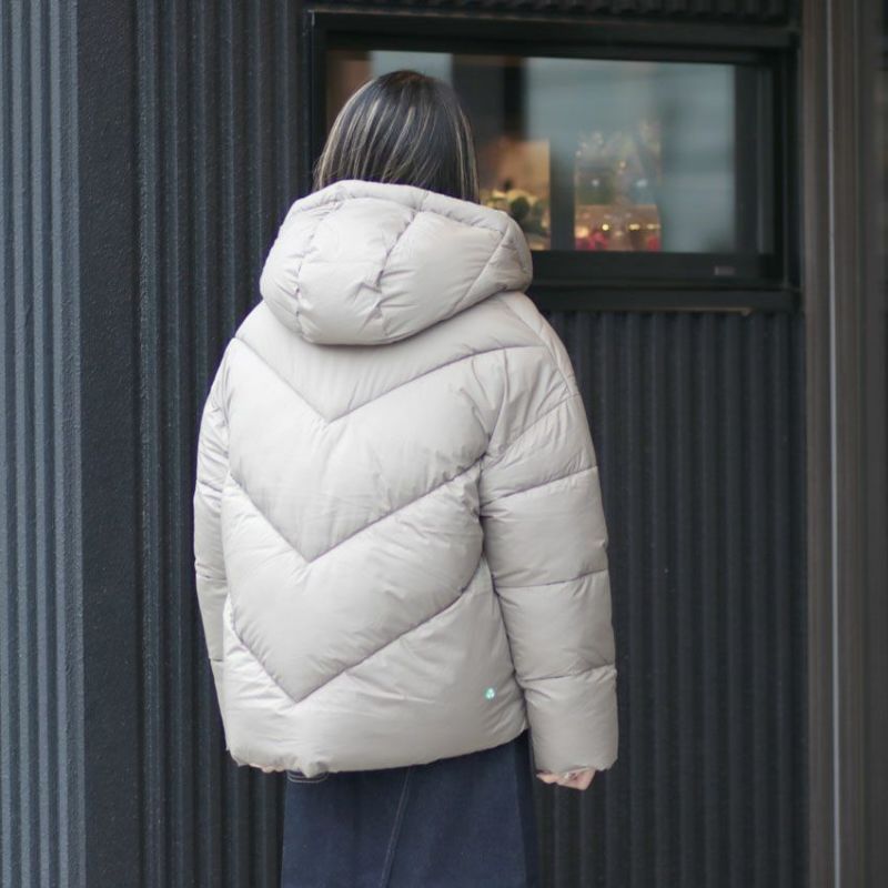 また通常のダウンとは異なる斜めに入ったキルティングパターンになっており、太って見えやすいダウンの弱点を解決してくれます。