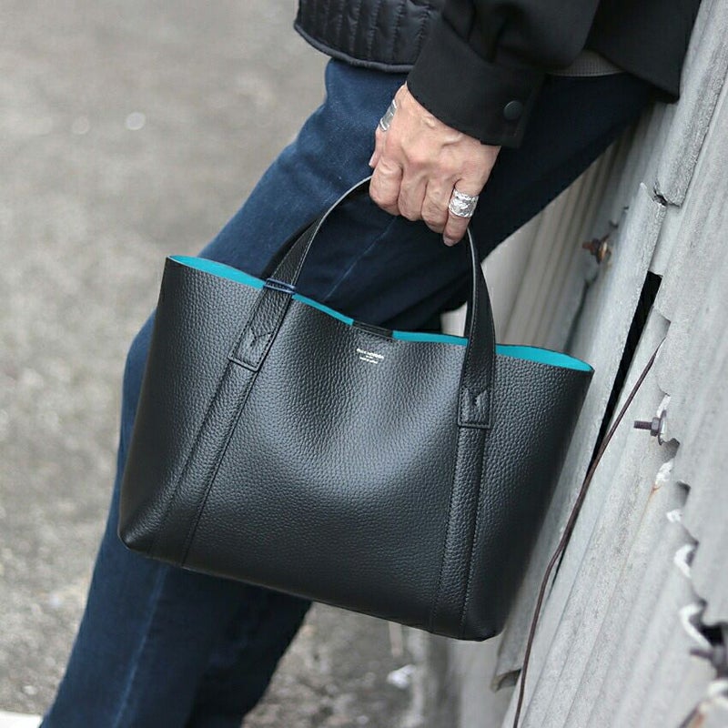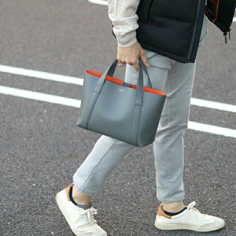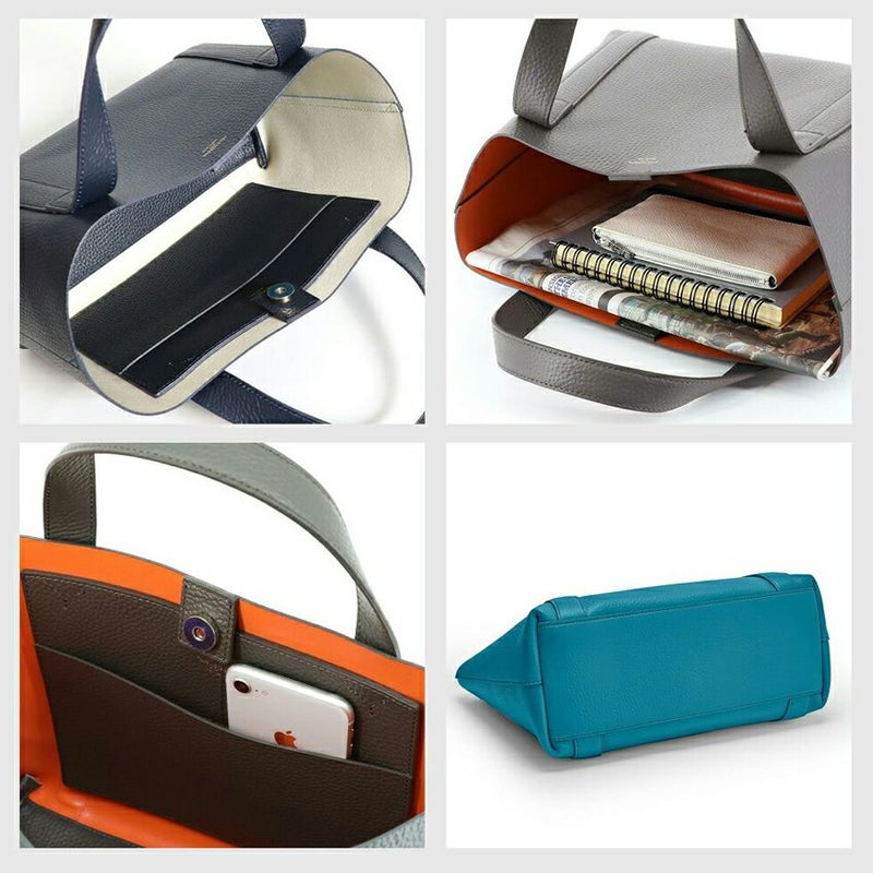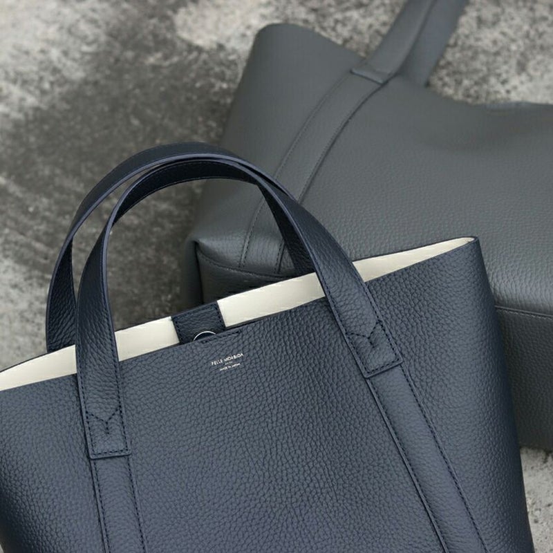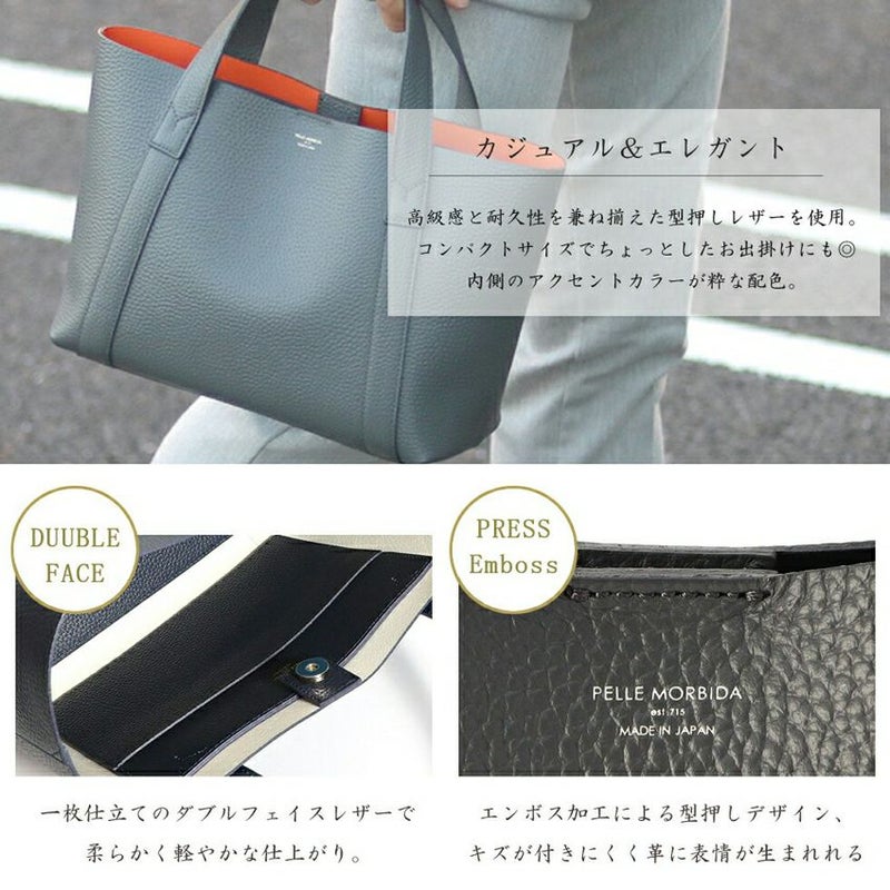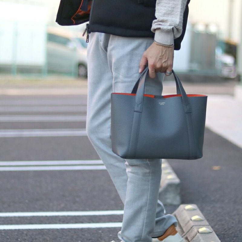大人感がある洗練されたデザインのミニバッグ。 ダブルフェイスレザーで裏面の配色もとっても粋なデザインです。 リュックやトートはデカすぎる、、クラッチバッグでは小さすぎる、、 持っていると意外と便利なミニトート。しっかり"お洒落"で使えるアイテムです。 皮革生産地である姫路松原地区の牛革に、 細やかなシボ型を押した上質なシュリンク風レザーで仕上げています。
