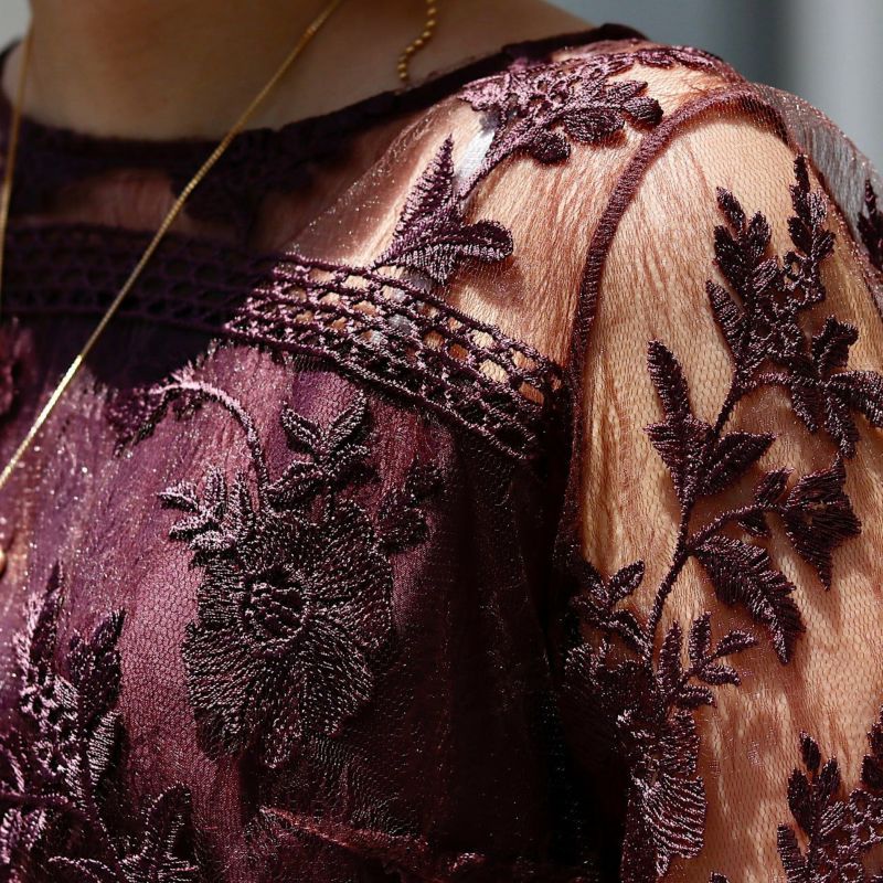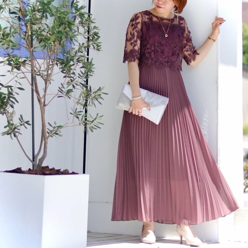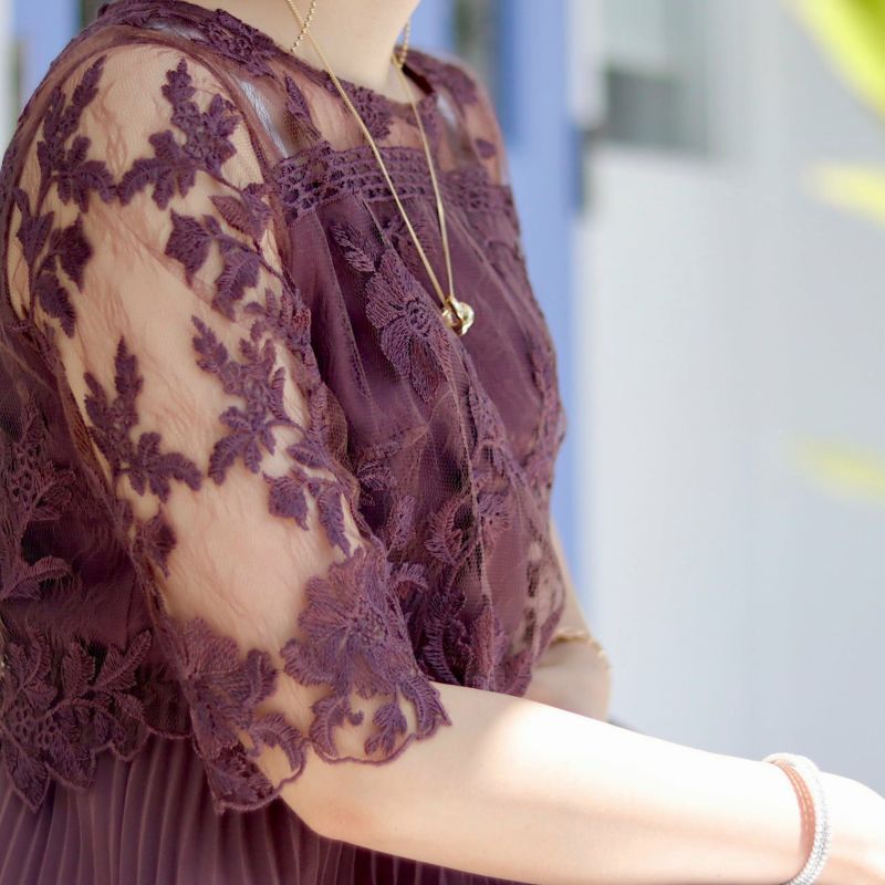 デコルテラインを綺麗に魅せてくれる魅力的なシアー感のあるオリジナル刺繍レース使いのワンピースドレス。