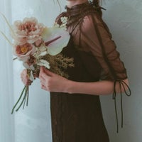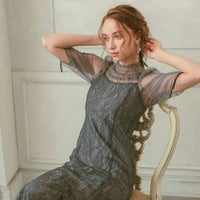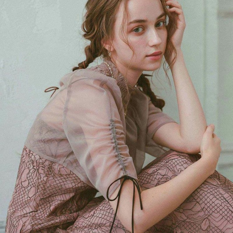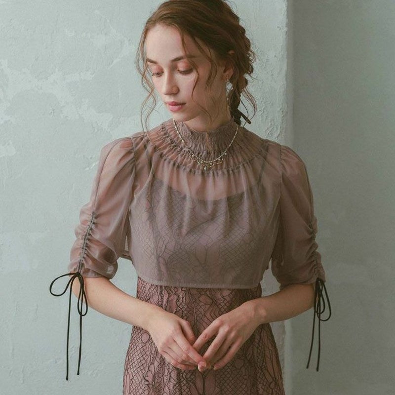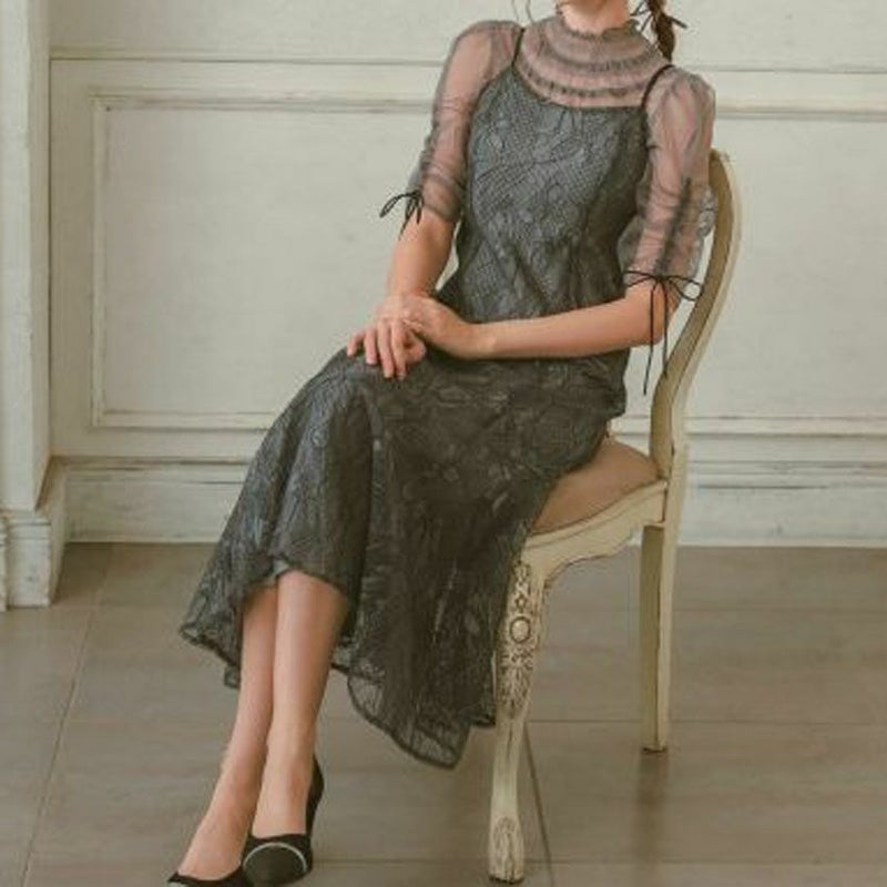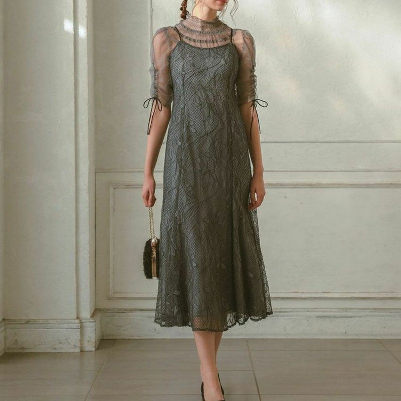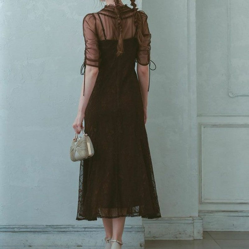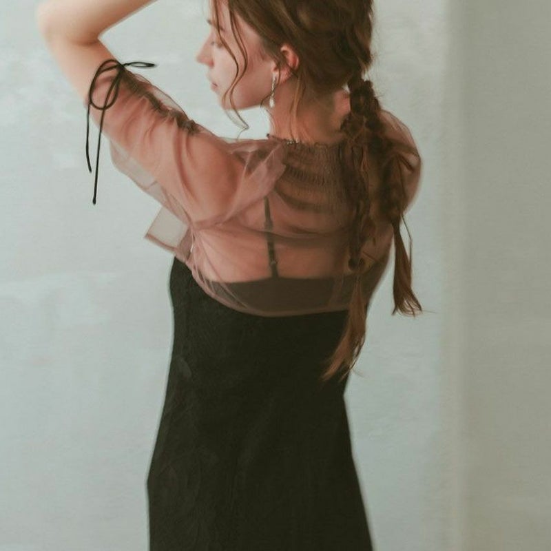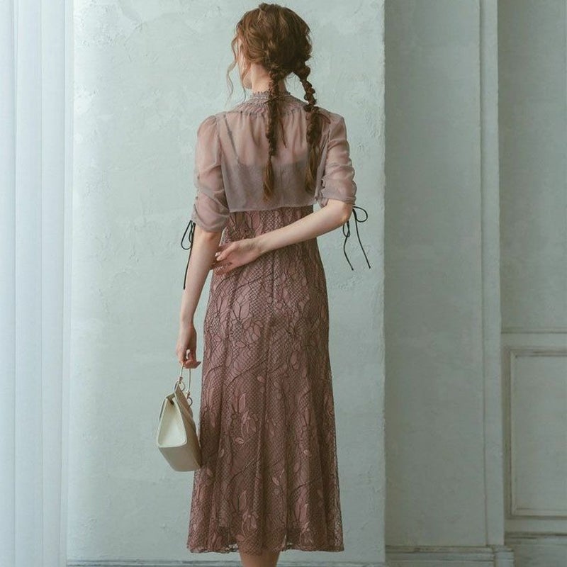 デザイン性の高いシアーブラウス×フラワーレースキャミのワンピース
