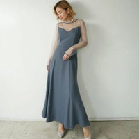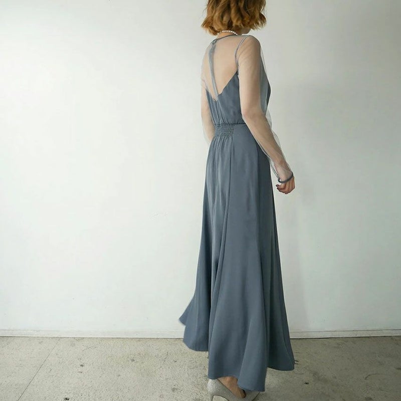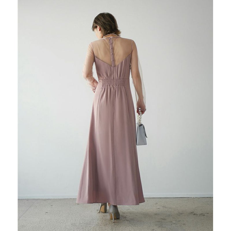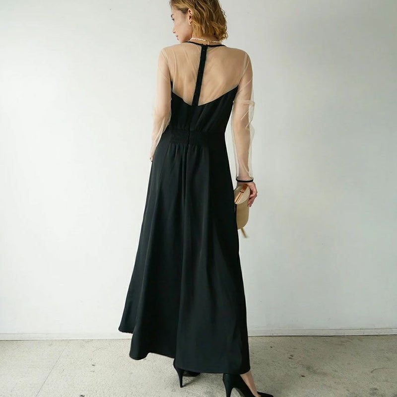 顔やデコルテをすっきり綺麗に見せる変形Vネックのシアーワンピース。