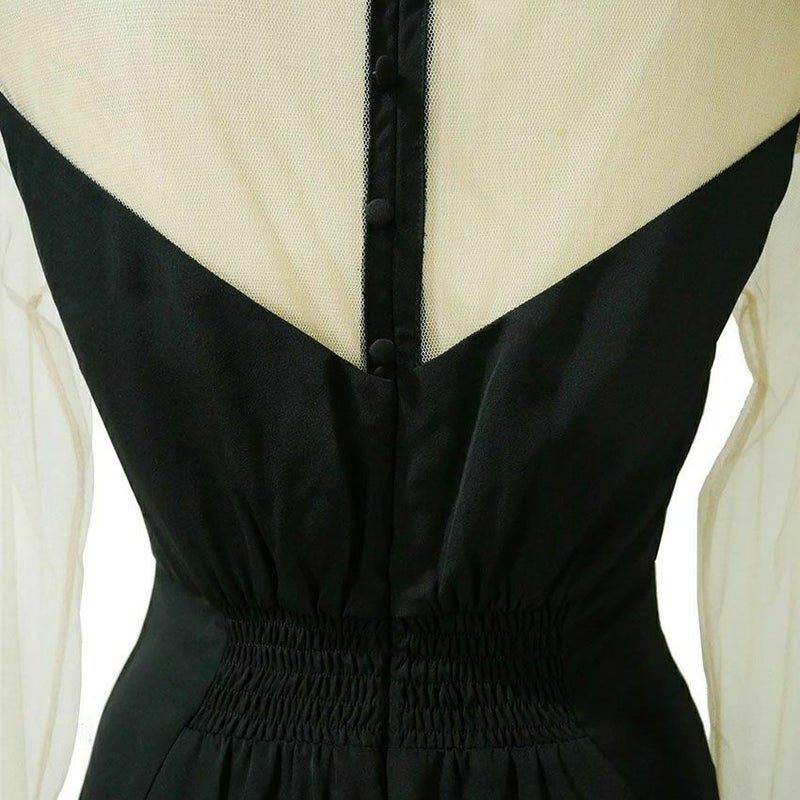 背中はディープVカットで仕上げ、さらにくるみ釦をあしらったバックコンシャスな1枚です。