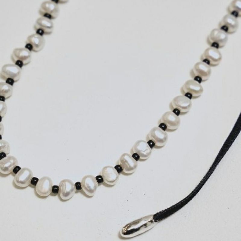 淡水パールとベロア生地のリボンを使用したチョーカー。