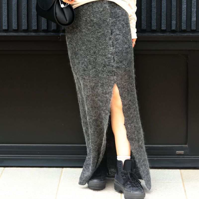 程よいシアー感で女性らしさを引き立てるデザインスカート。モヘア混の柔らかな糸で編み上げられ、フロントには華奢なボタンをたっぷりあしらいました。