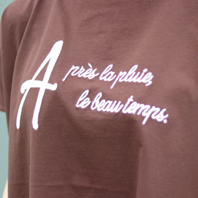 前身頃にチェーンステッチでロゴを入れたTシャツ。