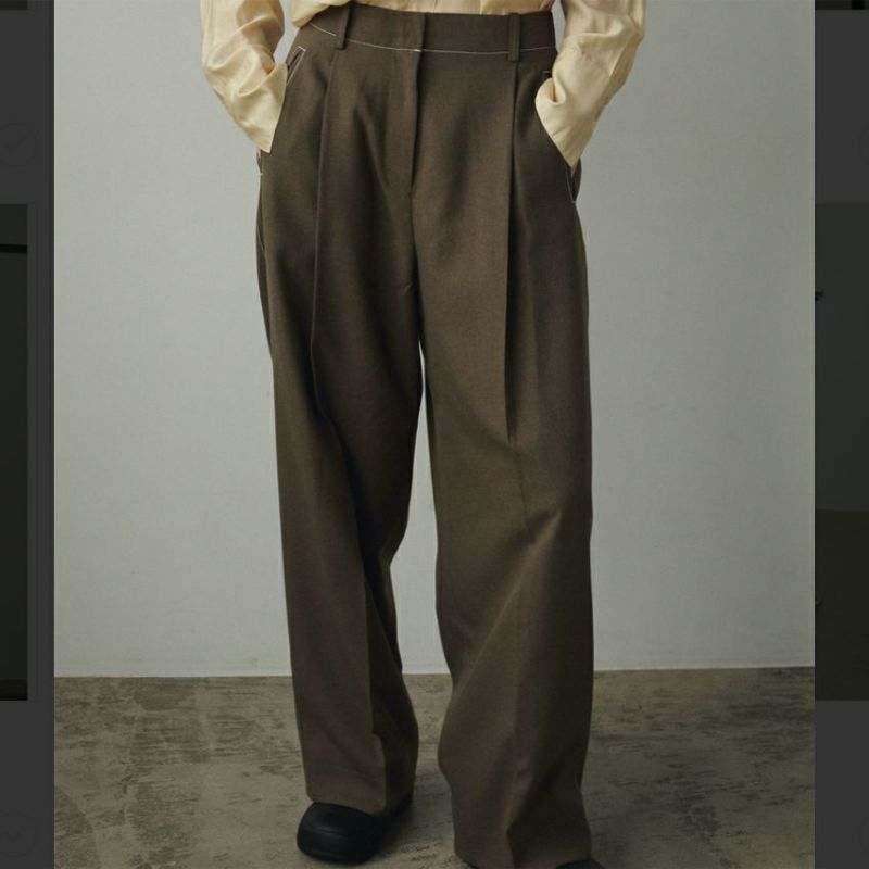杢調の綺麗めに見える生地を使用したタックパンツ。ステッチを配色にしてポイントにしています。