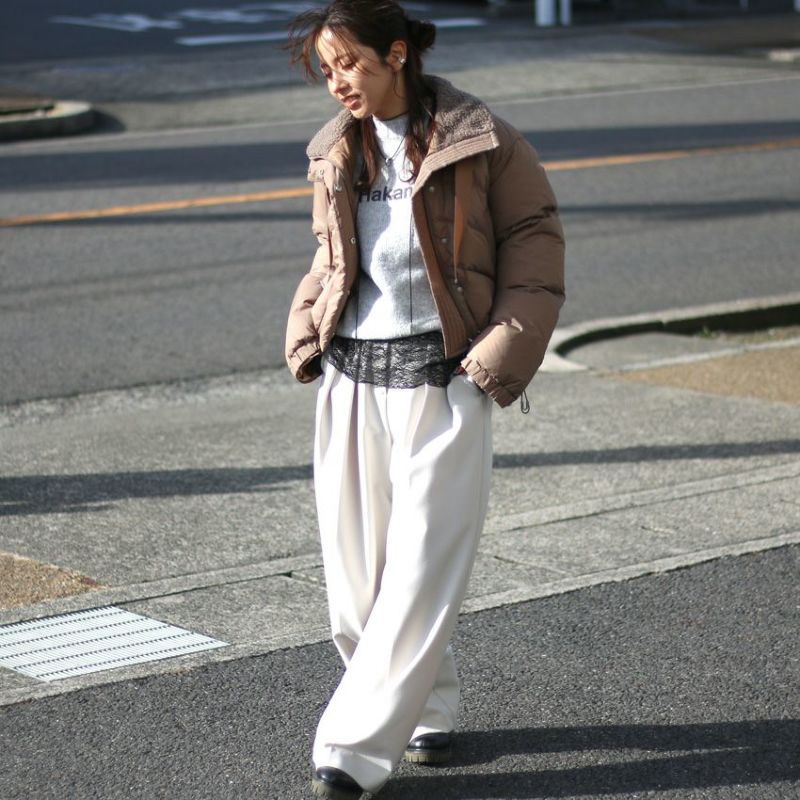 カジュアルになりがちなダウンに、女性らしい華やかさをプラスしています。
