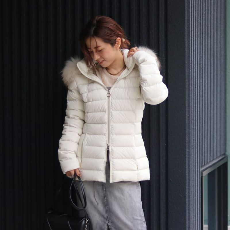 伸縮性に優れたストレッチ素材を使用した、細身のシルエットが女性らしいラクーンファーフード付きのダウンジャケット。