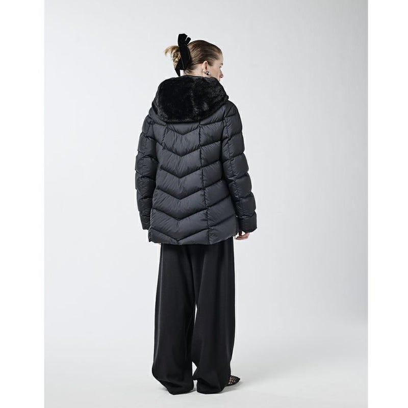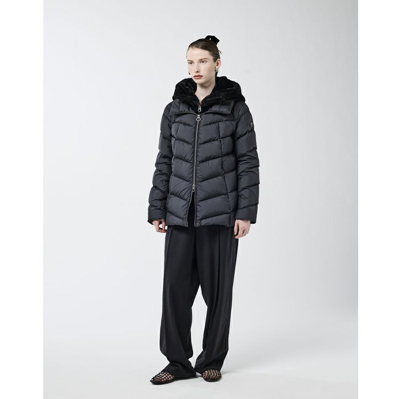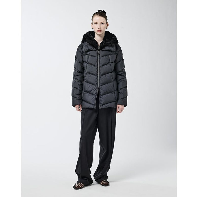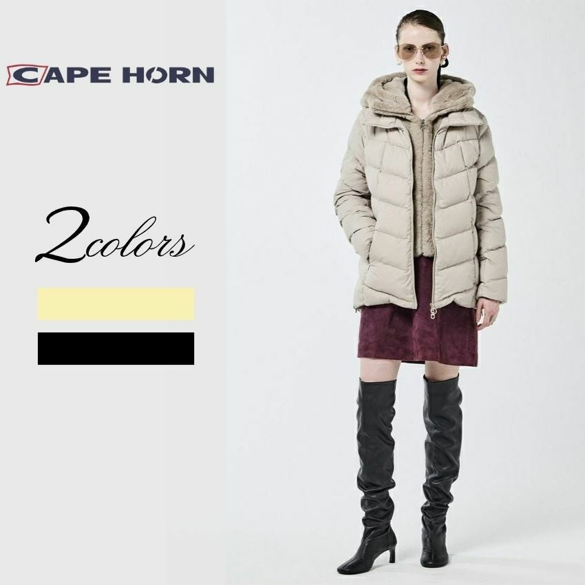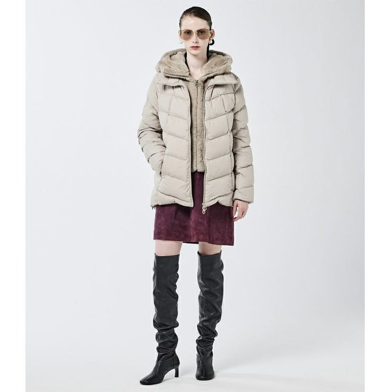 定番のセミロングダウンに、人気のエコファーとマット素材を組み合わせた上品なコンビネーションモデル。