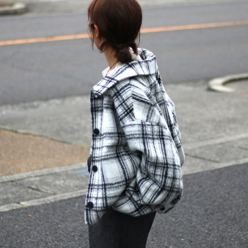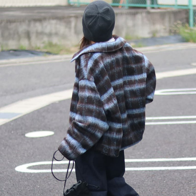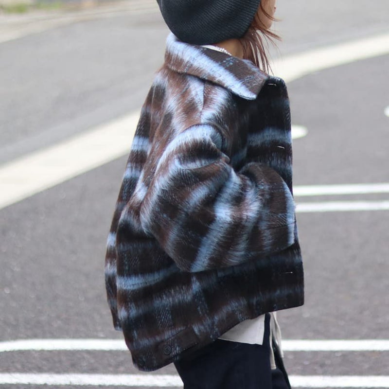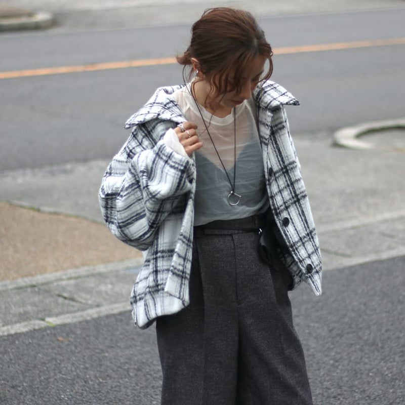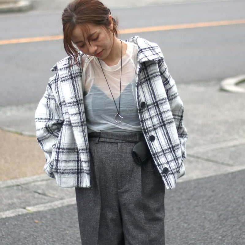 ふんわりとしたシャギー素材と大柄チェックが目を惹く、