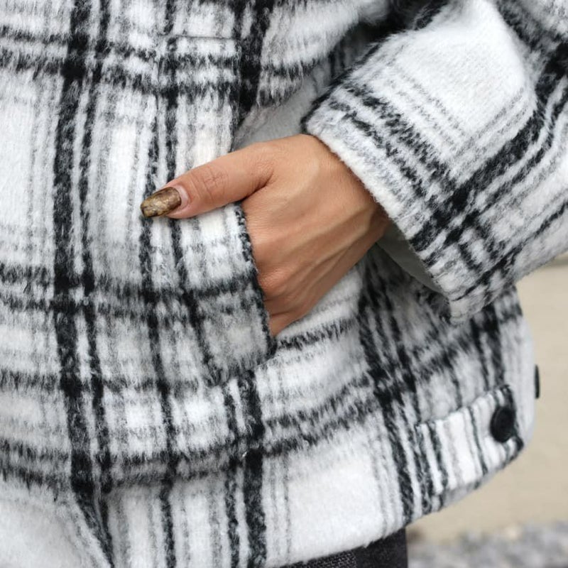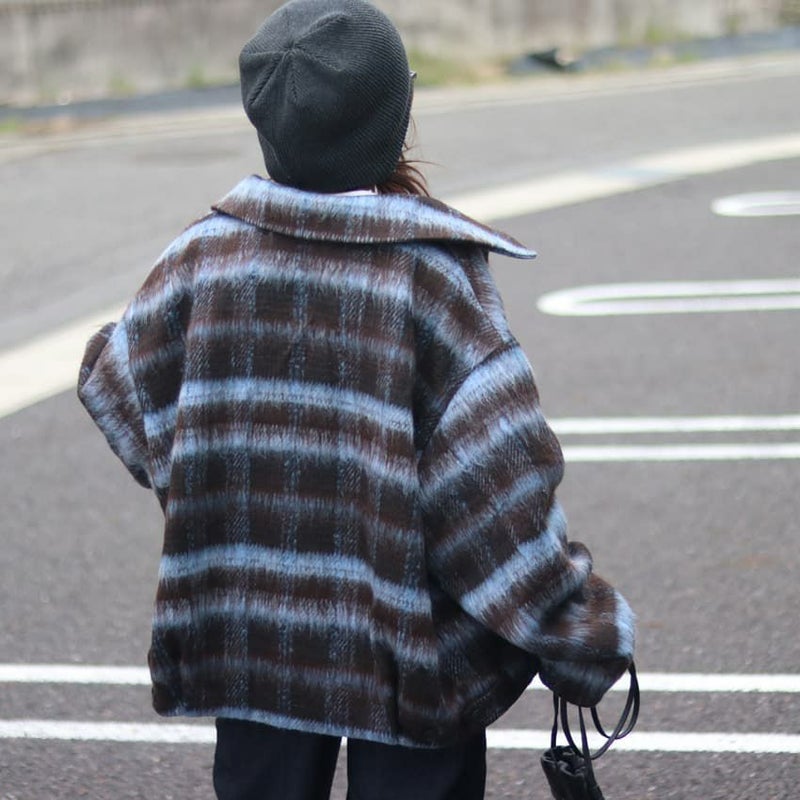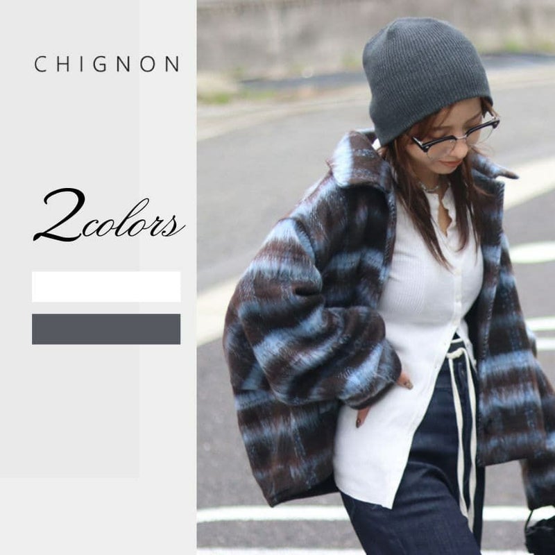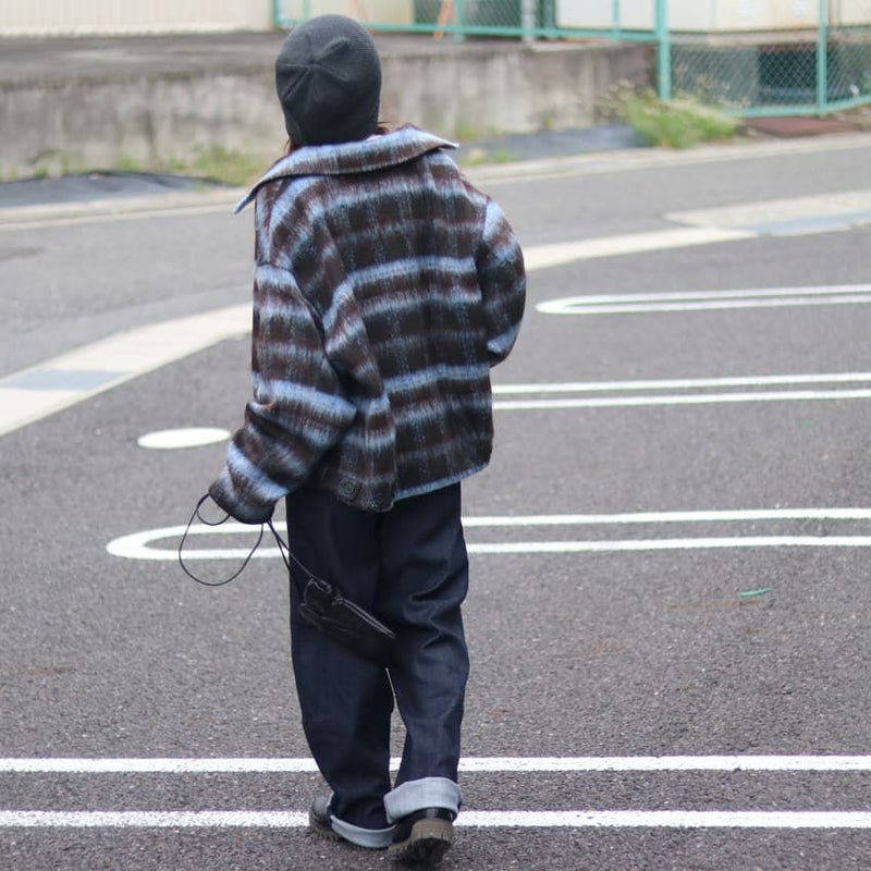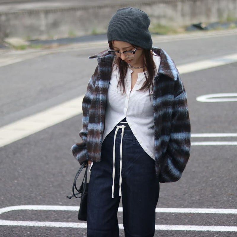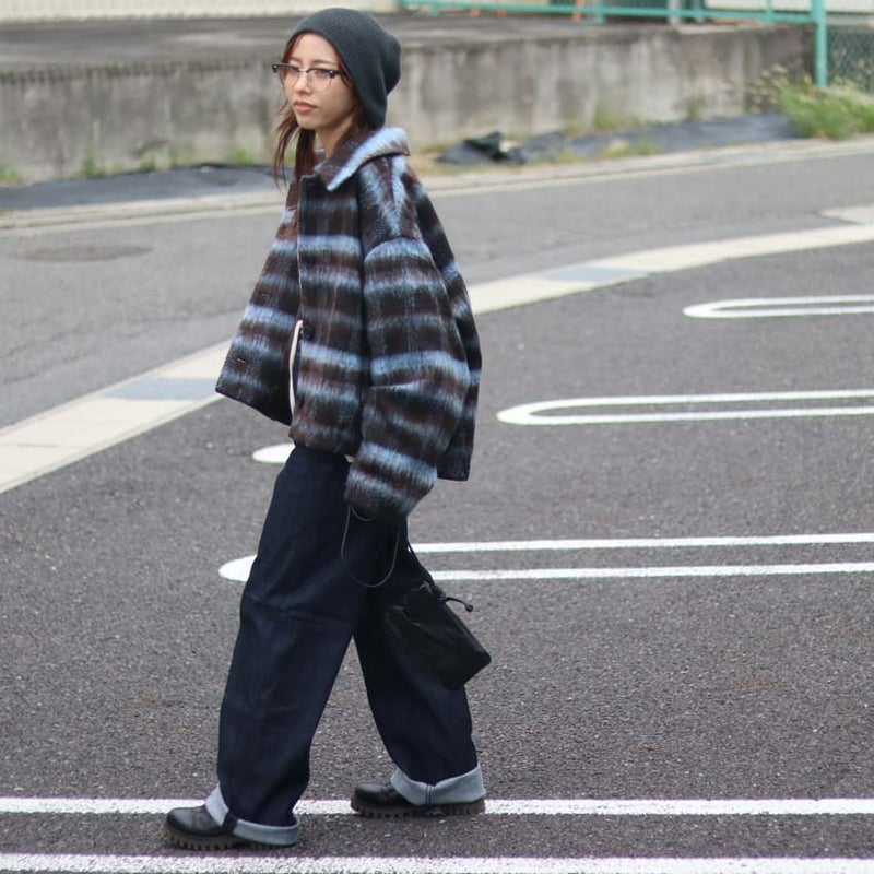 ふんわりとしたシャギー素材と大柄チェックが目を惹く、