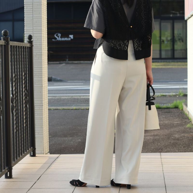 また、セミワイドパンツなので小柄な女性でも綺麗に合わせていただけます。