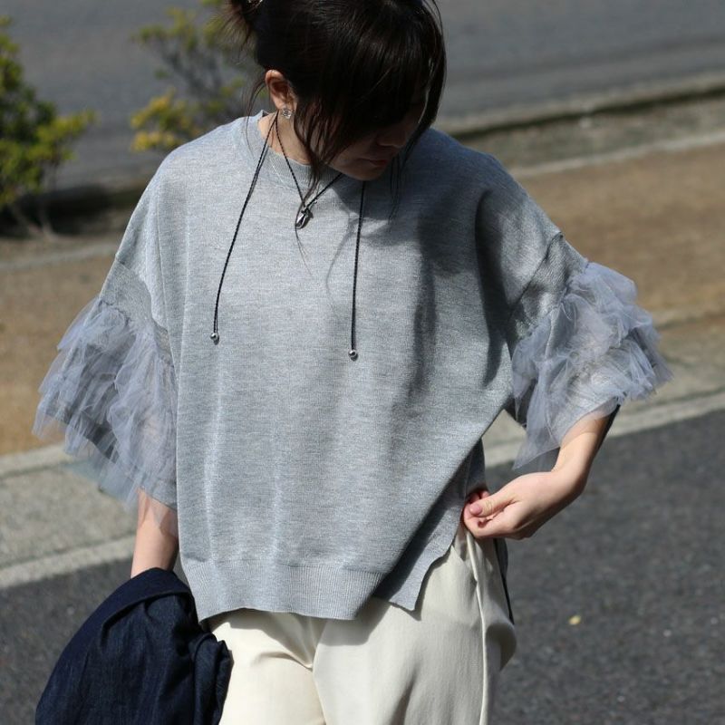 3段チュールのボリューム袖が視線を引く薄手のサマーニット。