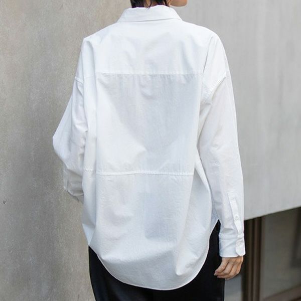 後ろの身巾をたっぷりとって展開したパターンにより、立体的で丸みのある女性らしいバックスタイルに仕立てたシンプルなレギュラーカラーシャツです。