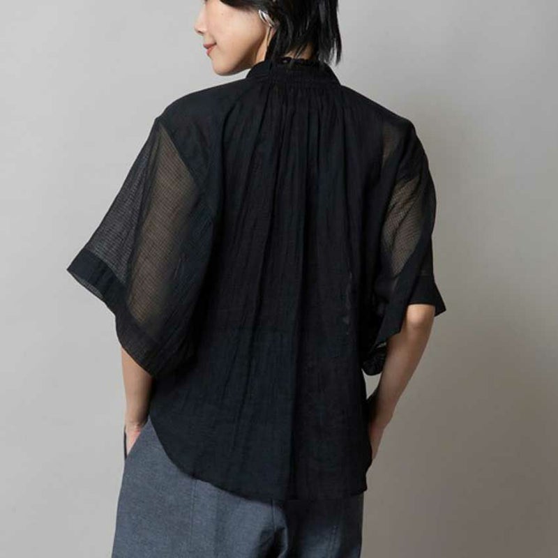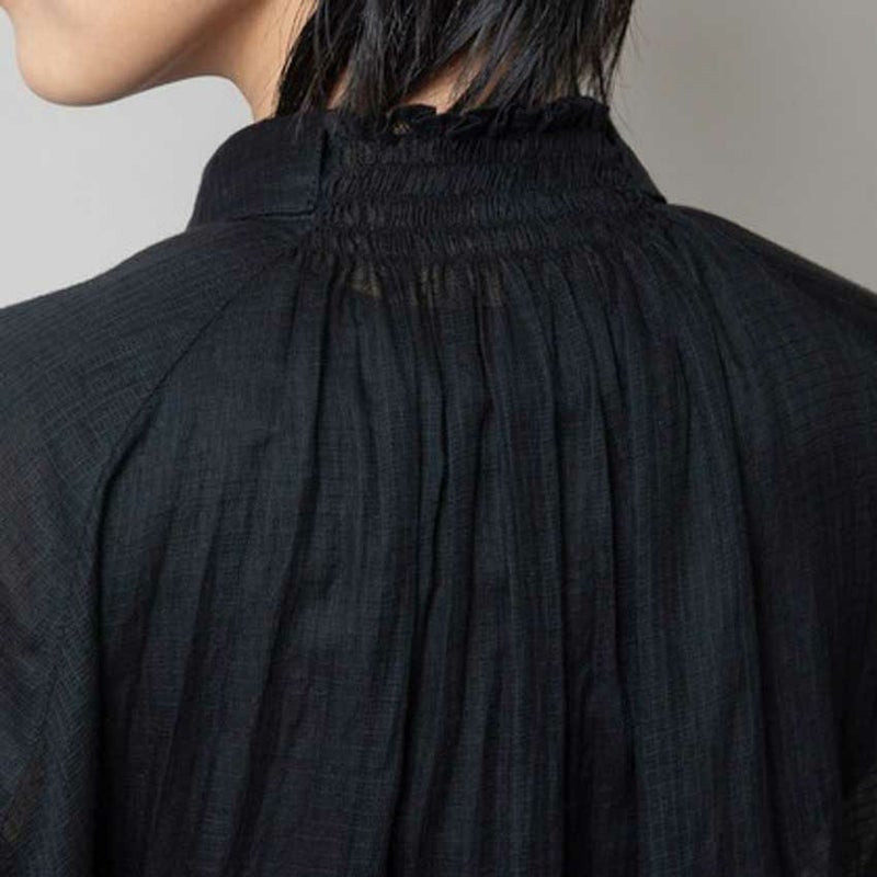 シャツカラーの後ろ衿にゴムシャーリングを施したアーカイブのディテールとシアーな素材を掛け合わせて