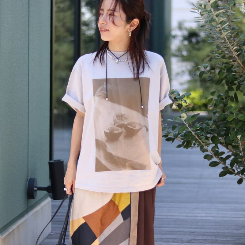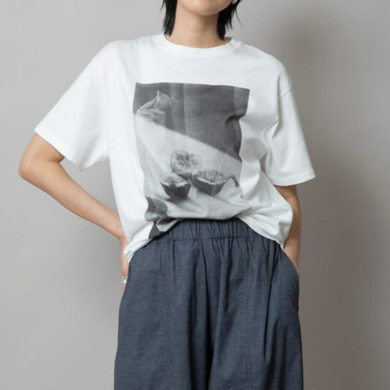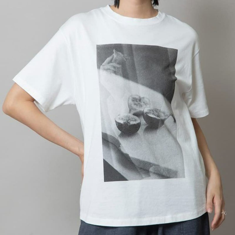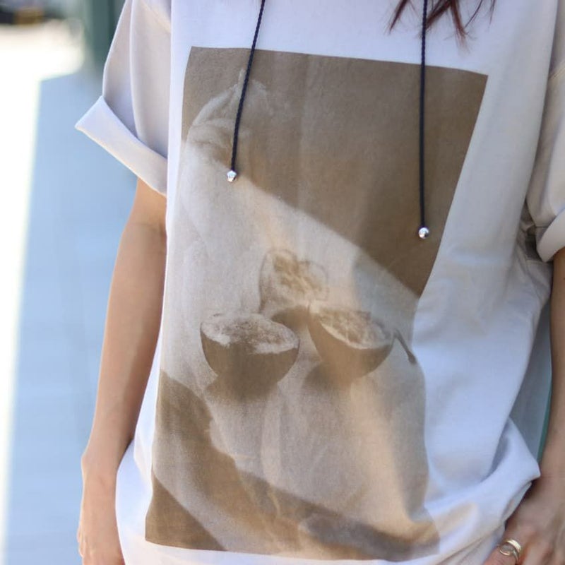 イチジクを手にした瞬間と、大理石のプレートに置かれた姿を重ねた、ちょっとアートなフォトTシャツ。