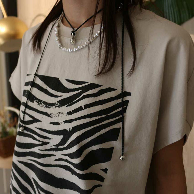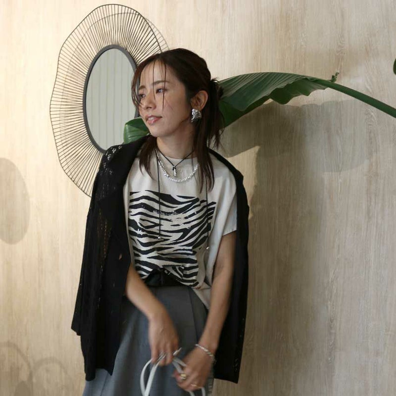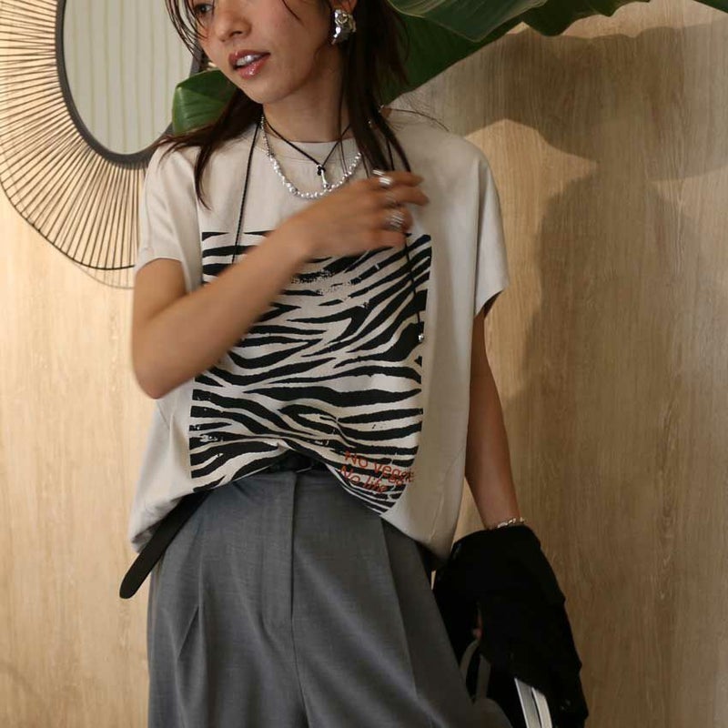 モスキーな色合いのゼブラがらを取り入れたシルエットもプリントも大人カジュアルなデザイン性。