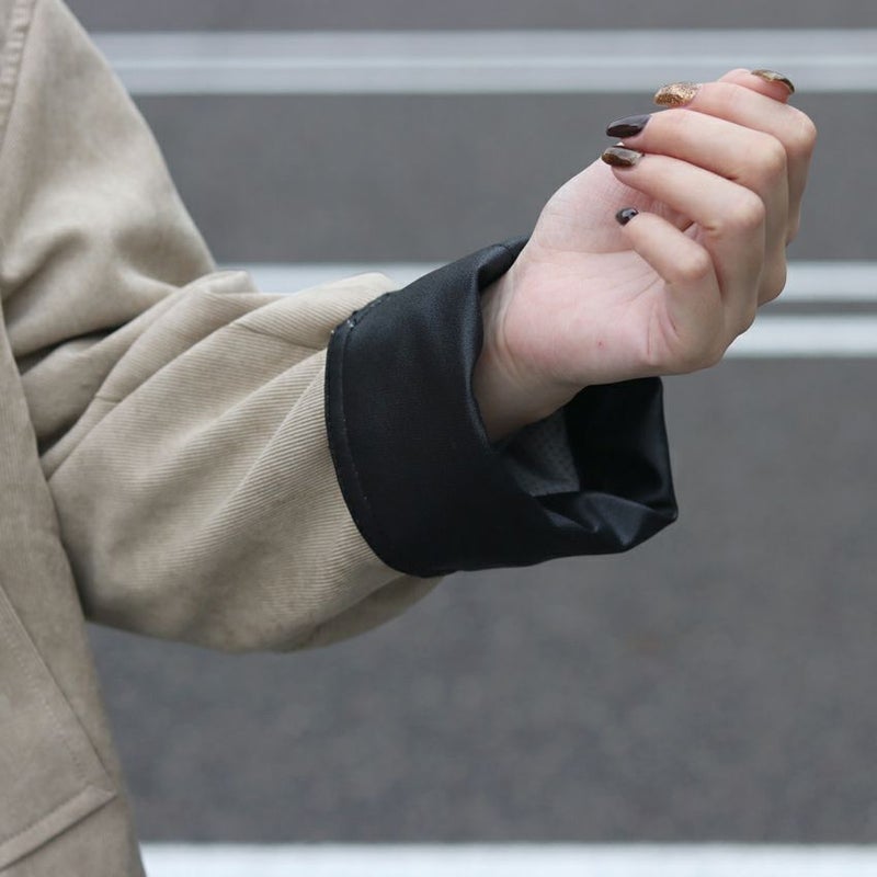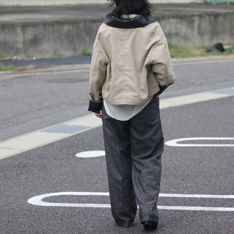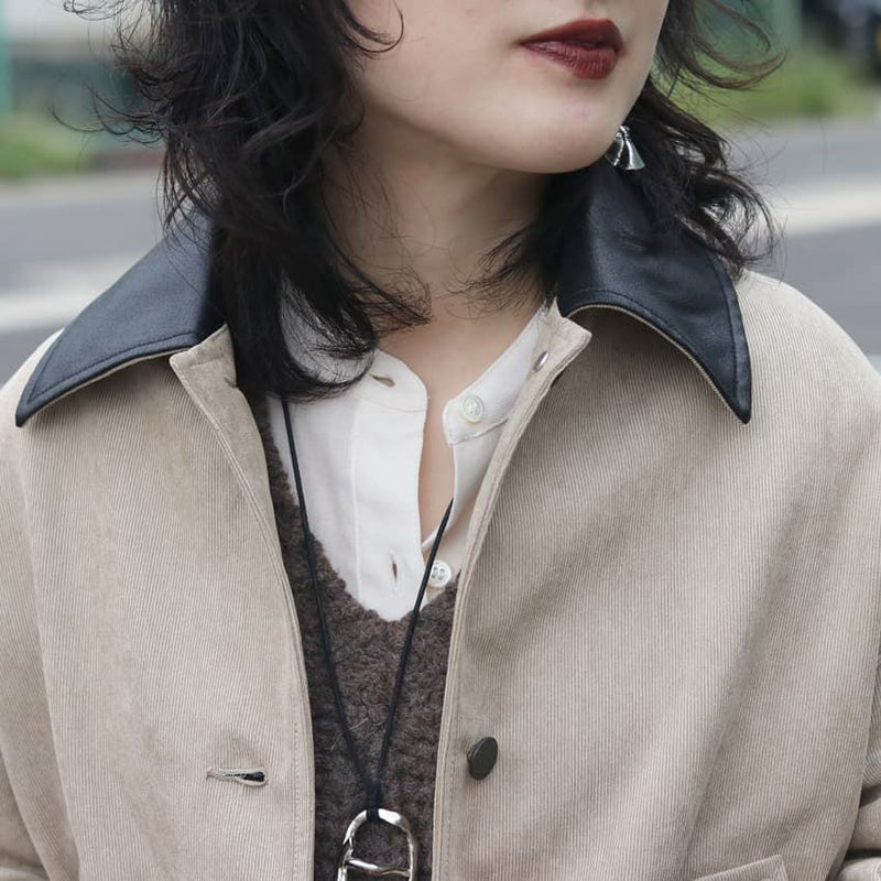 さらに、表衿と袖口の見返しにはオイルドレザーのような質感を持つバックサテンを配色使いし、ヴィンテージライクな奥行きをプラスしています。