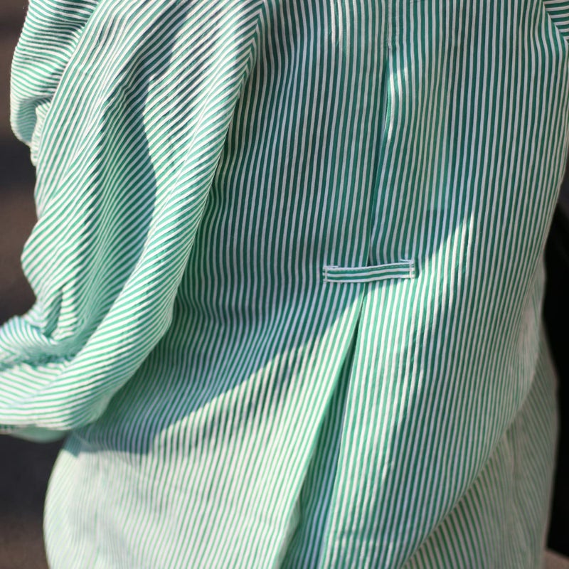 さらに後ろ身頃にはボックスタックを施し、衿ぐり下までは中縫い、そこから解放してタブ&カンヌキで留める構造にすることで、タックが開きすぎず、美しいバックシルエットが生まれます。