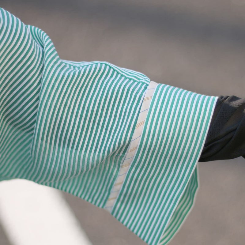 袖口のカフスには、ストライプと相性の良い異柄の共地をさりげなく挟み込み、動いたときにだけ覗く上品なアクセントに。