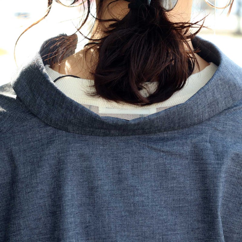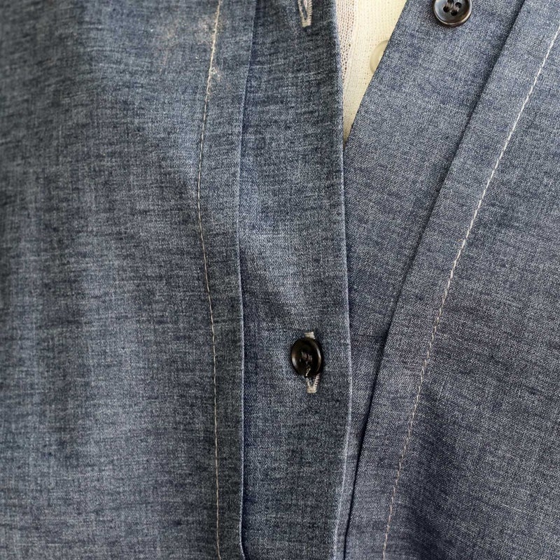 リサイクルポリエステルと60sオーガニックヘンプを混紡したシャンブレー素材を使用した一着。
