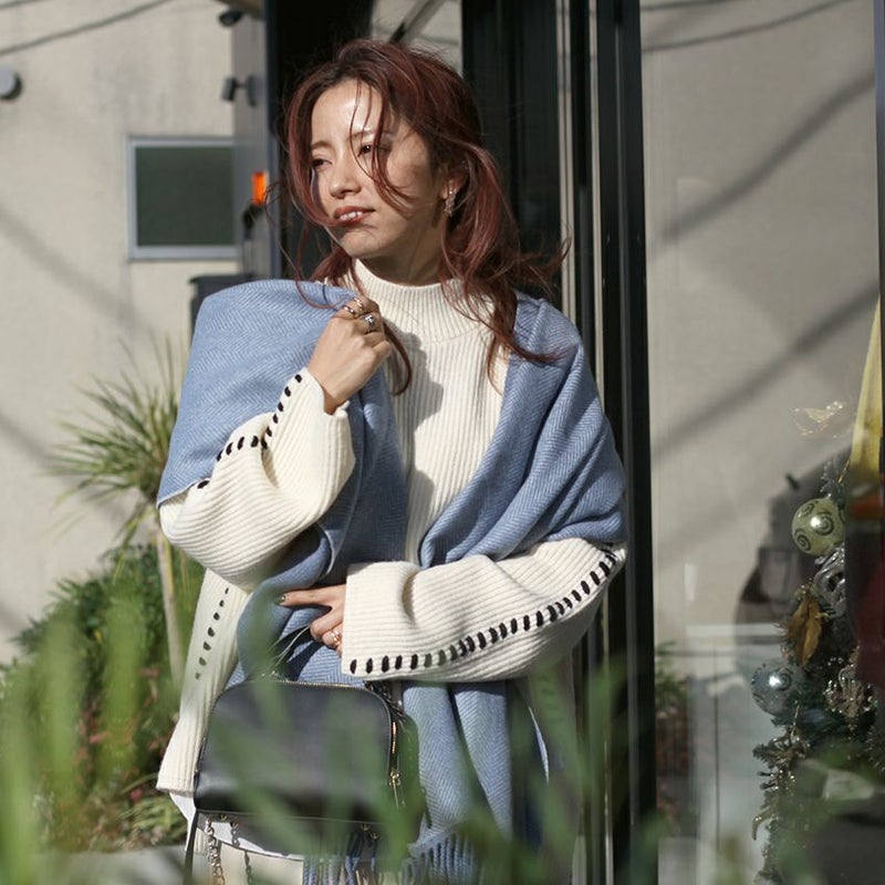 カシミアタッチのふんわり柔らかい素材を使用して、ショール感覚でも着用頂ける大判ストールにデザインしています。