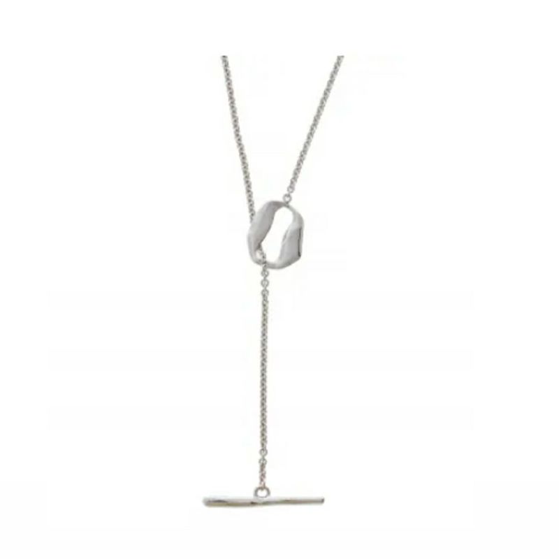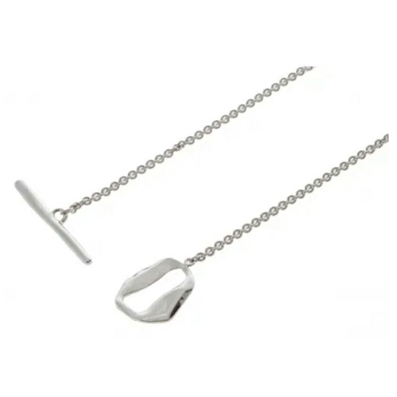穴に通すだけで簡単に着脱できる、ストレスフリーなネックレス。