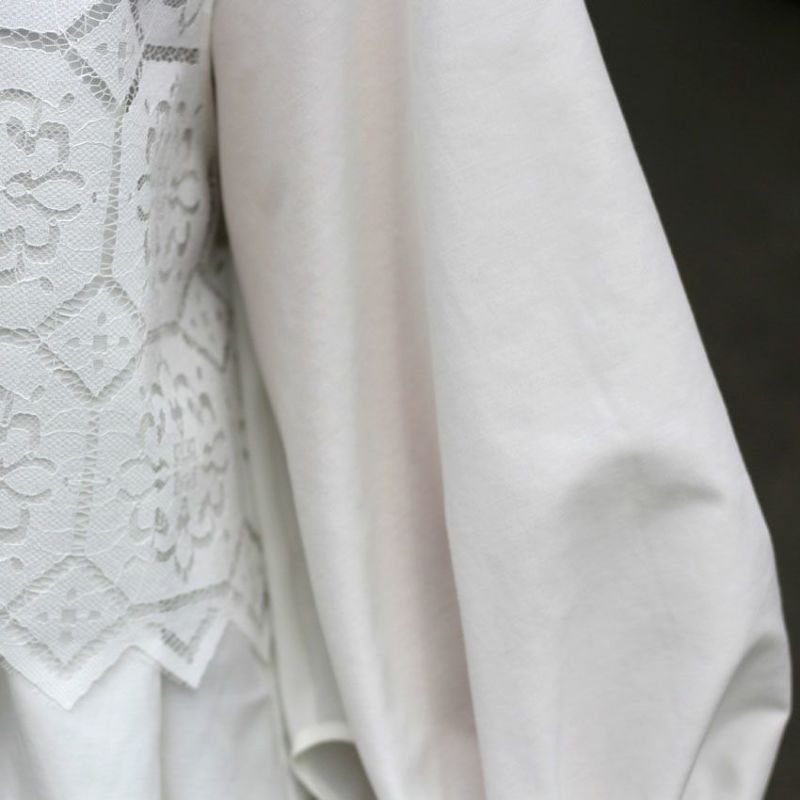 薄手のテトロンとコットンの混紡糸で織られた生地にケミカルレースを重ねたブラウス。