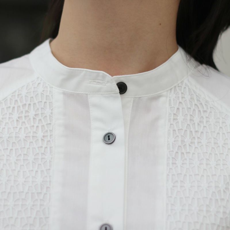 きちんと感のあるクルーネックに、控えめながら華やかさを添えるレースの透け感。