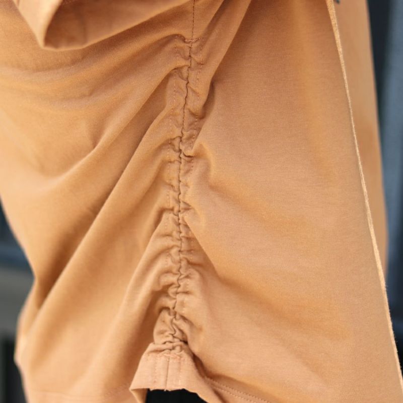サイドに入ったギャザーが、さりげない立体感と女性らしさをプラスしてくれるロゴTシャツ。